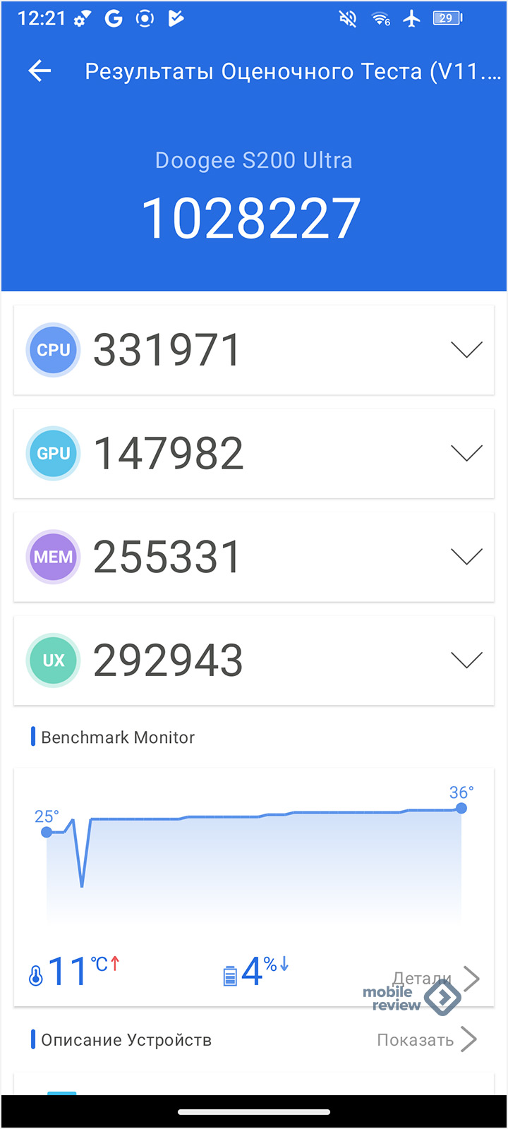 В тесте производительности AnTuTu v11 смартфон набирает около 1 млн баллов. В AnTuTu v10 производительность будет около 750 тысяч баллов. Благодаря такому толстому корпусу с металлическим шасси с перегревом проблем не возникает. В тестах устройство становится теплым, но на троттлинг нет и намека.