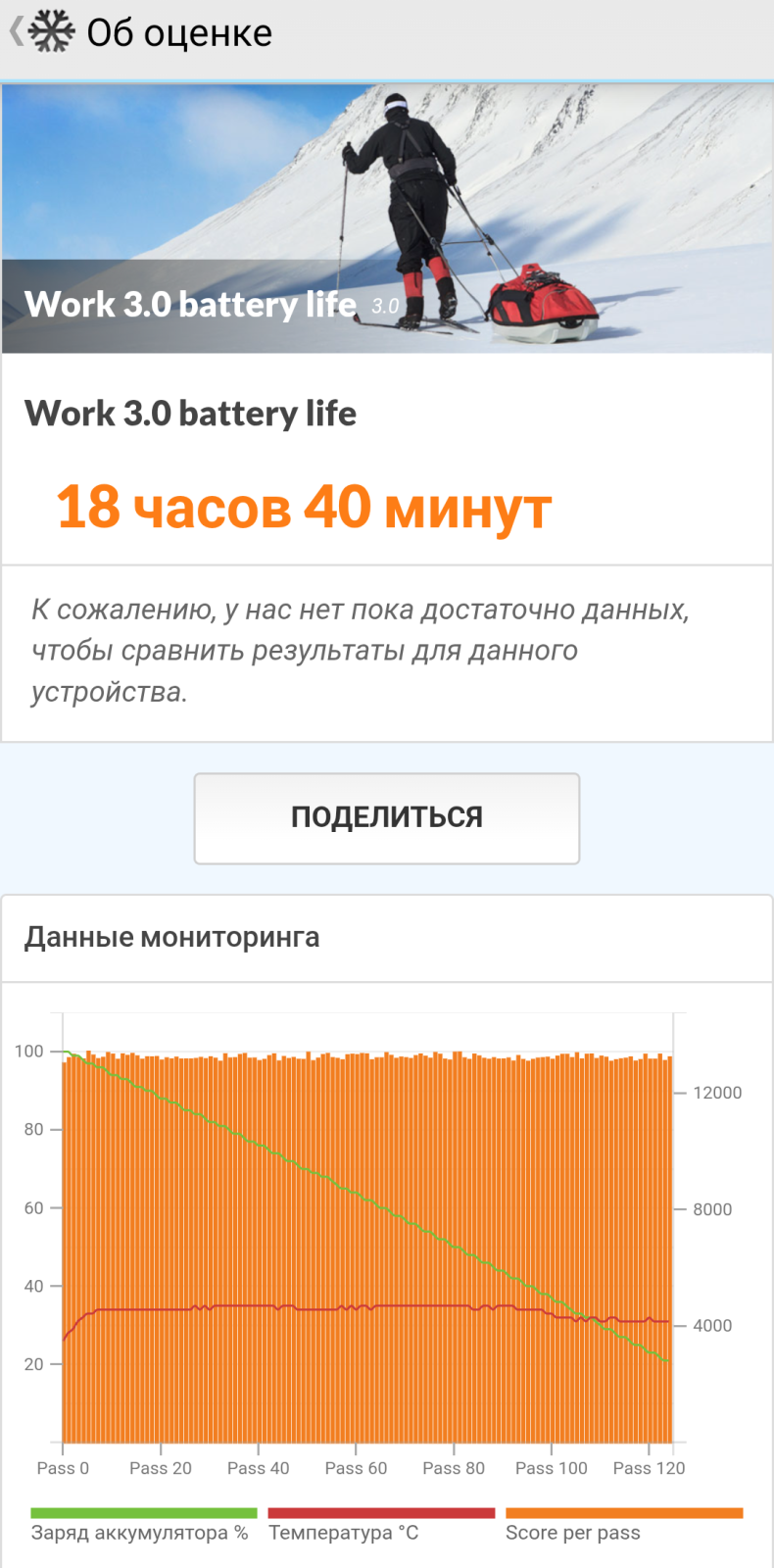 В тесте PCMARK, который имитирует повседневные задачи (интернет, видеосвязь, документы, редактирование фото и видео) смартфон на максимальной яркости продержался почти 19 часов. Отличный результат.