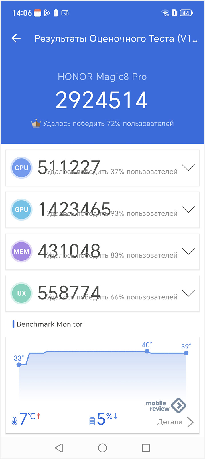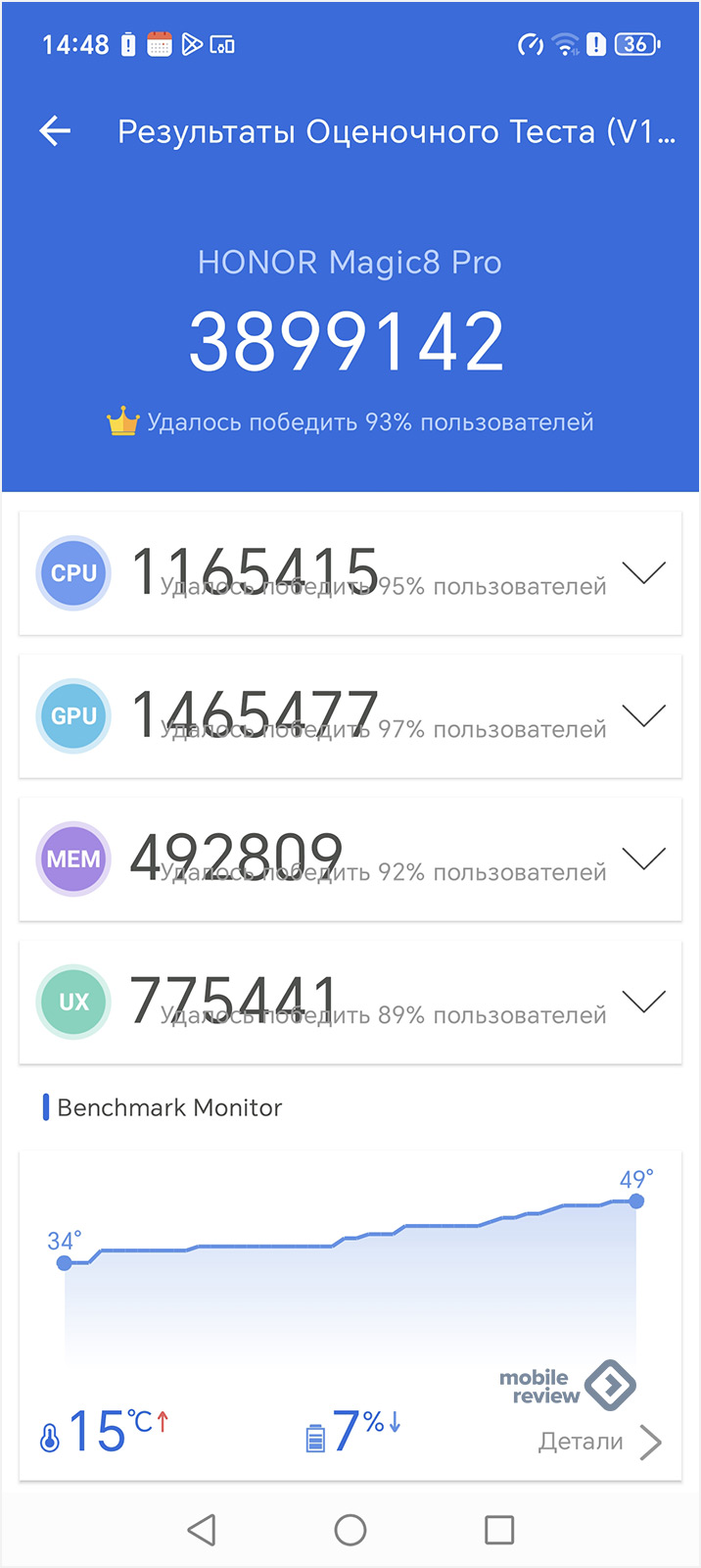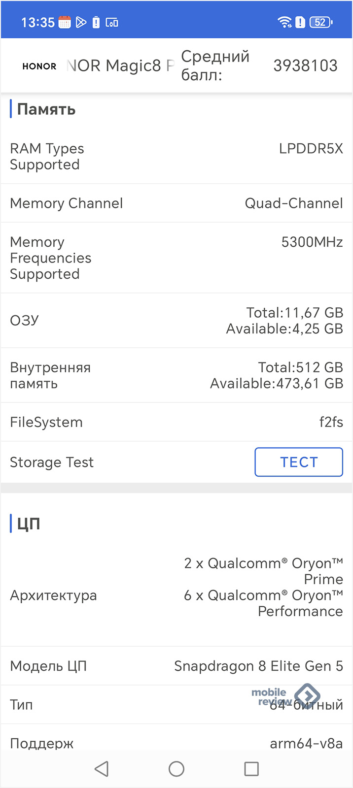В этой модели стоит Qualcomm Snapdragon 8 Elite Gen. 5 (3 нм), чипсет очень быстрый. Давайте посмотрим, как он работает в сбалансированном и производительном режимах. Смотрим на результаты синтетических тестов.