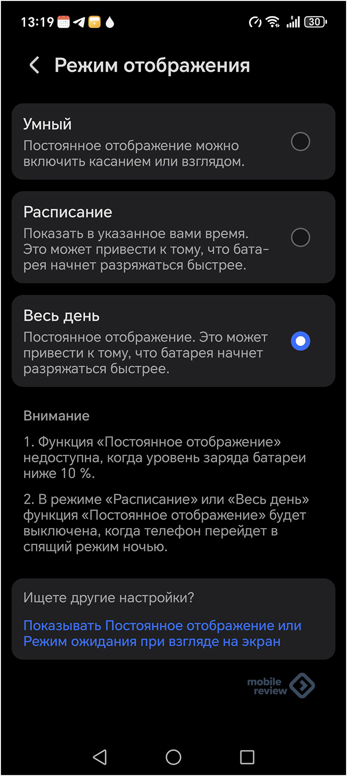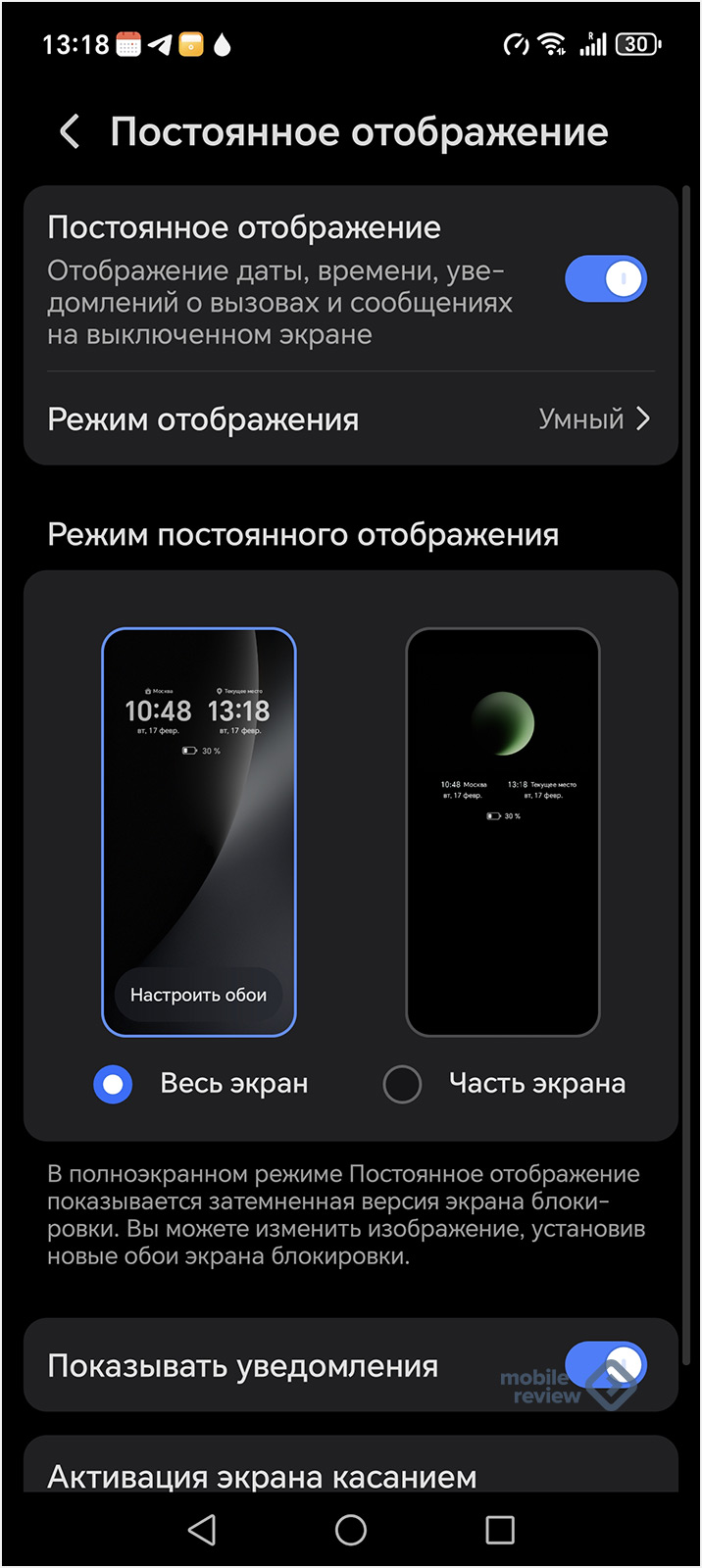 В аппарате гибко настраивается AoD, есть заставки для части экрана, а есть на весь экран.
