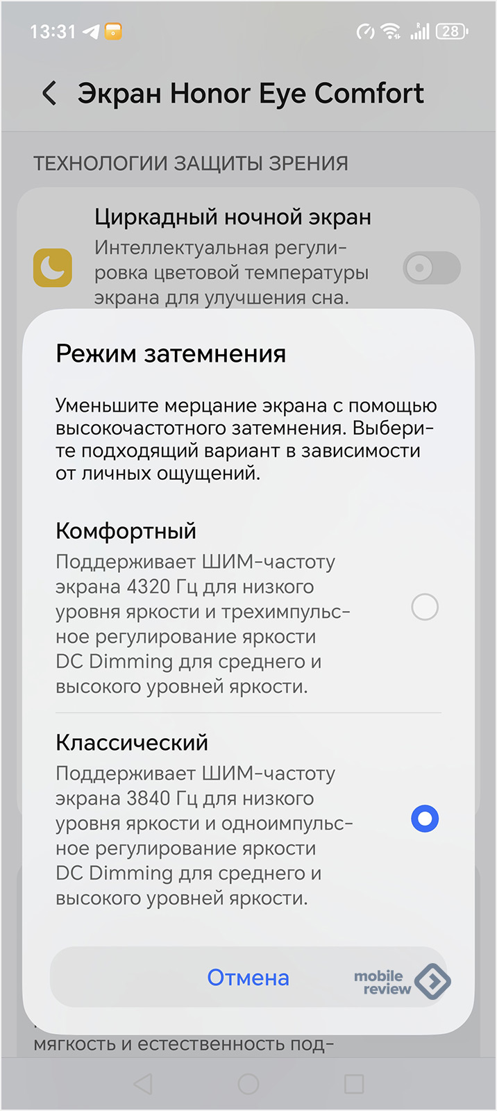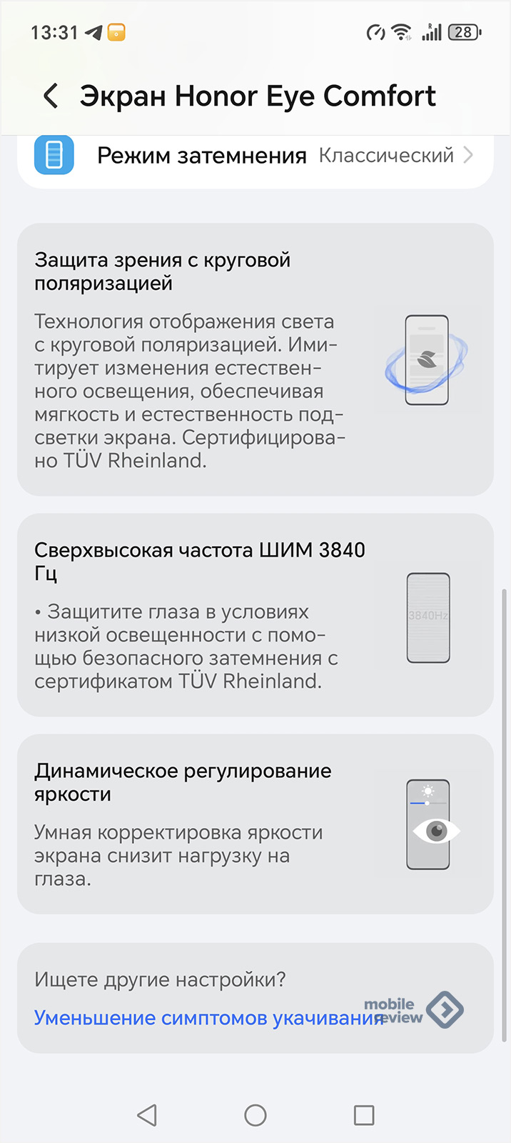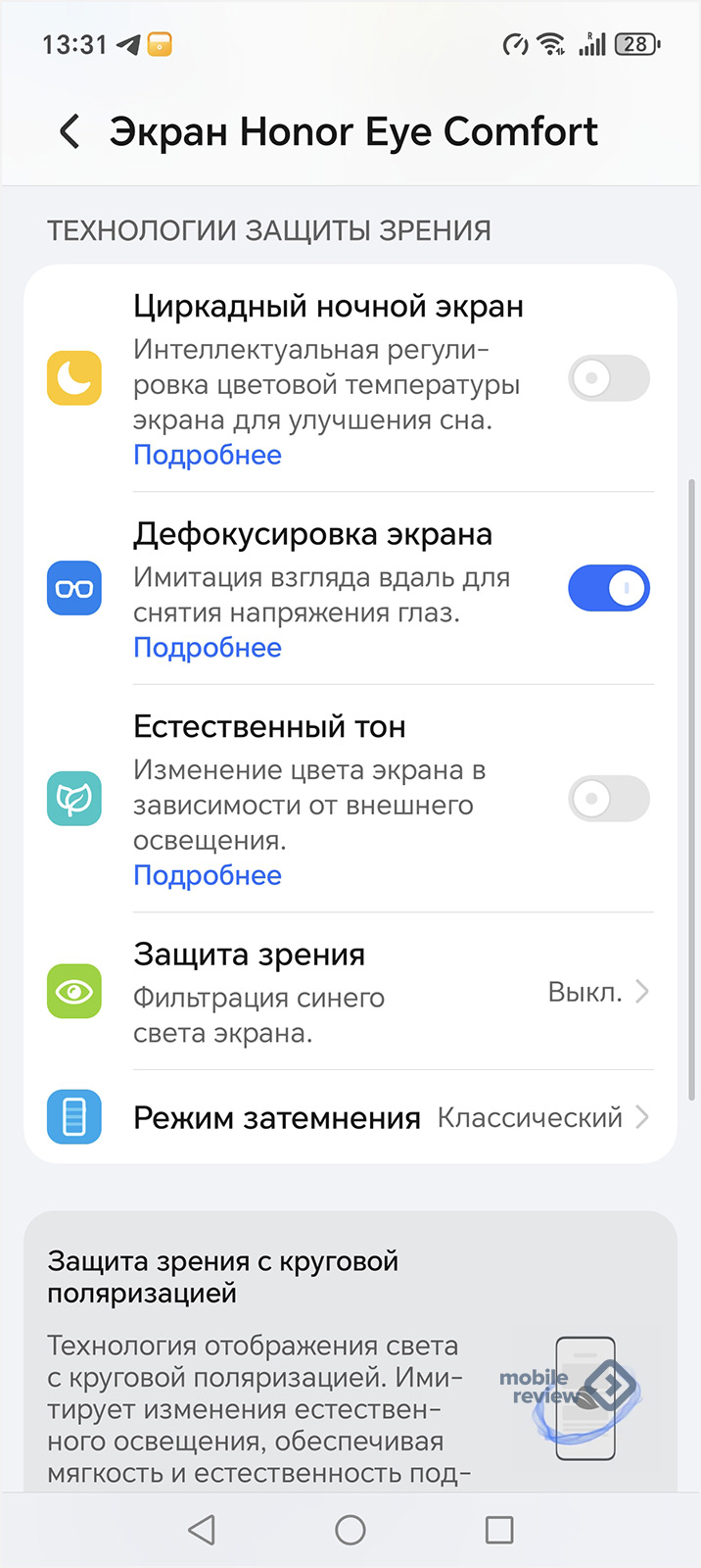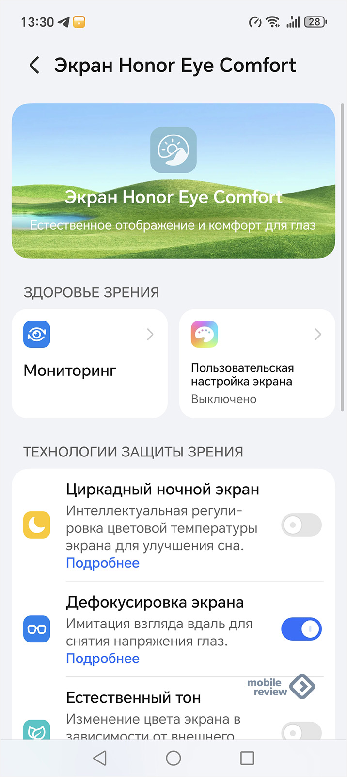 В разделе Honor Eye Comfort можно найти настройки, связанные с безопасностью зрения. Например, циркадные ритмы. Есть расфокусировка при взгляде на экран, когда края картинки немного размываются. Круговая поляризация позволяет имитировать естественное освещение (это свойство экрана), а вот естественный тон – это включение адаптивного изменения цветов на экране, где задействован sRGB-датчик.
