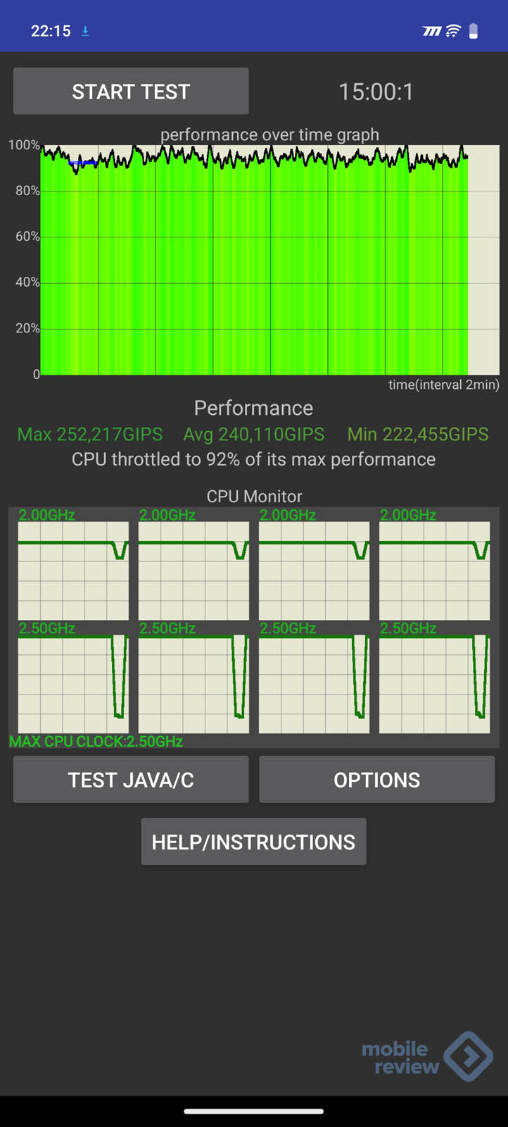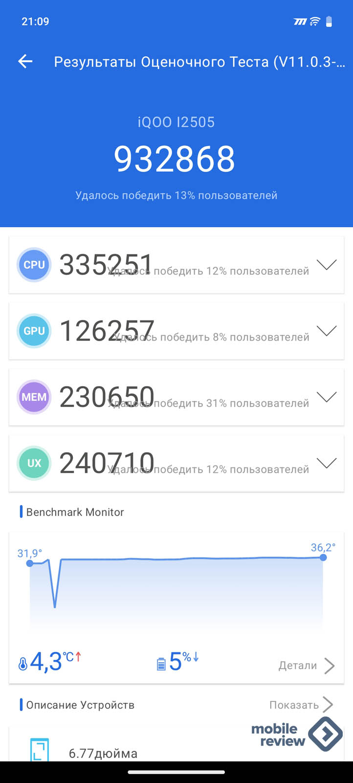 Я думаю, это реально делает смартфон универсальным: он спокойно тянет современные игры, приложения и мультимедиа, при этом не сажает батарею мгновенно. В тесте AnTuTu устройство набирает почти миллион баллов, а троттлинг-тест показал падение производительности всего на 8% при максимальной нагрузке — почти идеальный результат для смартфона такого типа.