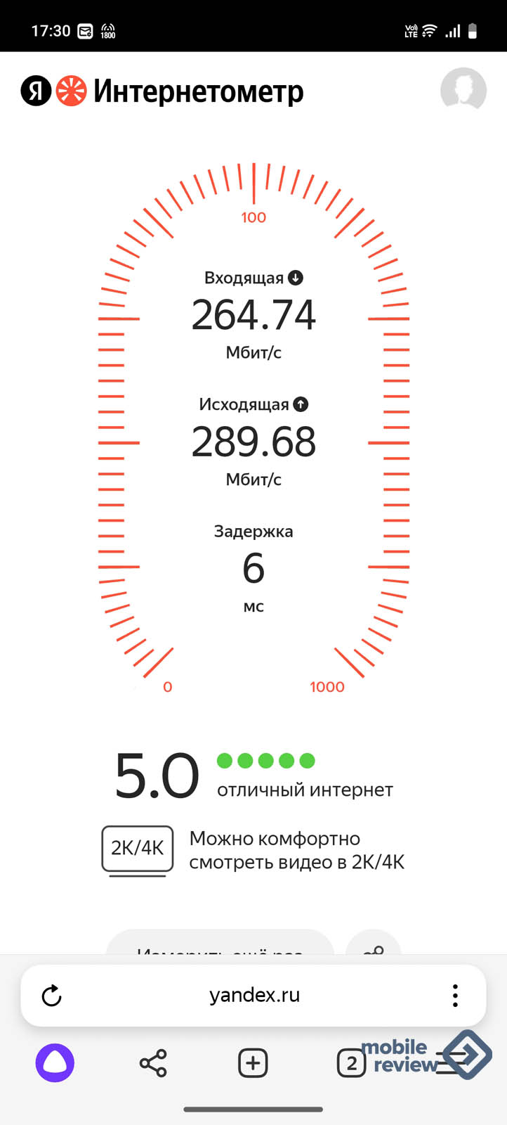 С Wi-Fi все тоже хорошо: при подключении к домашнему маршрутизатору с поддержкой 2,4 и 5 ГГц скорость держится около 300 Мбит/с в обе стороны.