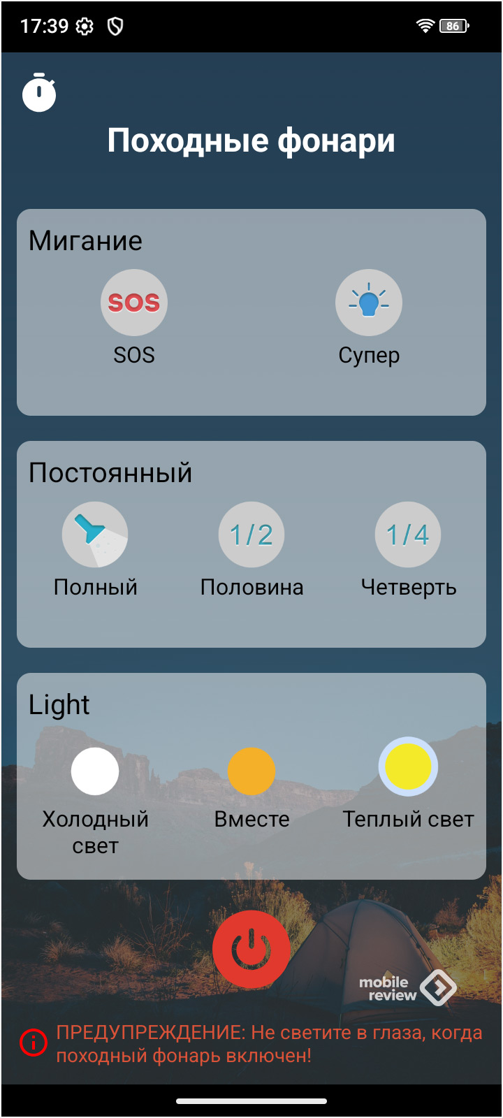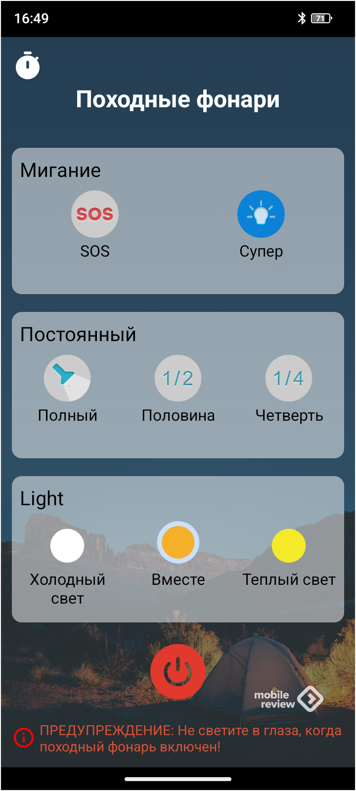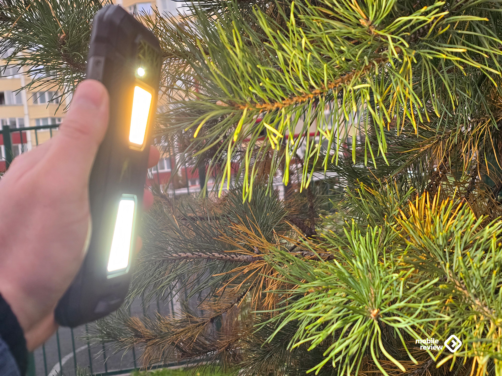 Внизу корпуса есть массивная петля — вполне функциональная штука, чтобы прицепить карабин и повесить смартфон на рюкзак. На задней панели расположились две большие LED-панели: одна светит холодным белым, другая — теплым. Выглядит мощно, особенно если включить их обе одновременно — можно спокойно заменить фонарь в походе.