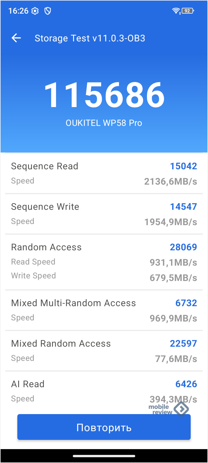 Аппарат продается только в одной конфигурации — 8 ГБ оперативки LPDDR4x и 512 ГБ встроенной памяти. Думаю, для устройства за 18 000 рублей это очень даже неплохо. Еще более приятный момент — скорость накопителя: около 2100/1900 МБ/с. Думаю, это уровень UFS 3.1, и для работы с приложениями или переносом файлов такой показатель позволяет не раздражаться на тормоза.