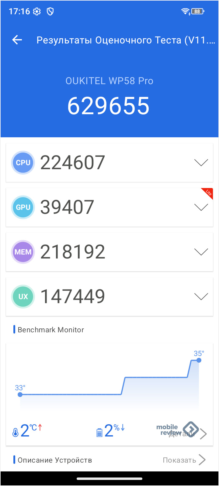 Что касается реальной работы — смартфон не «рвет на куски» своей быстротой, но частота экрана 120 Гц помогает интерфейсу двигаться плавно, а быстрая оперативка и накопитель не дают тормозов при обычных задачах. Узкое место тут все же процессор, но, думаю, для целевой аудитории это не критично. Подобные защищенные гаджеты берут не для игр, а для уверенной автономности и стабильной работы системы.