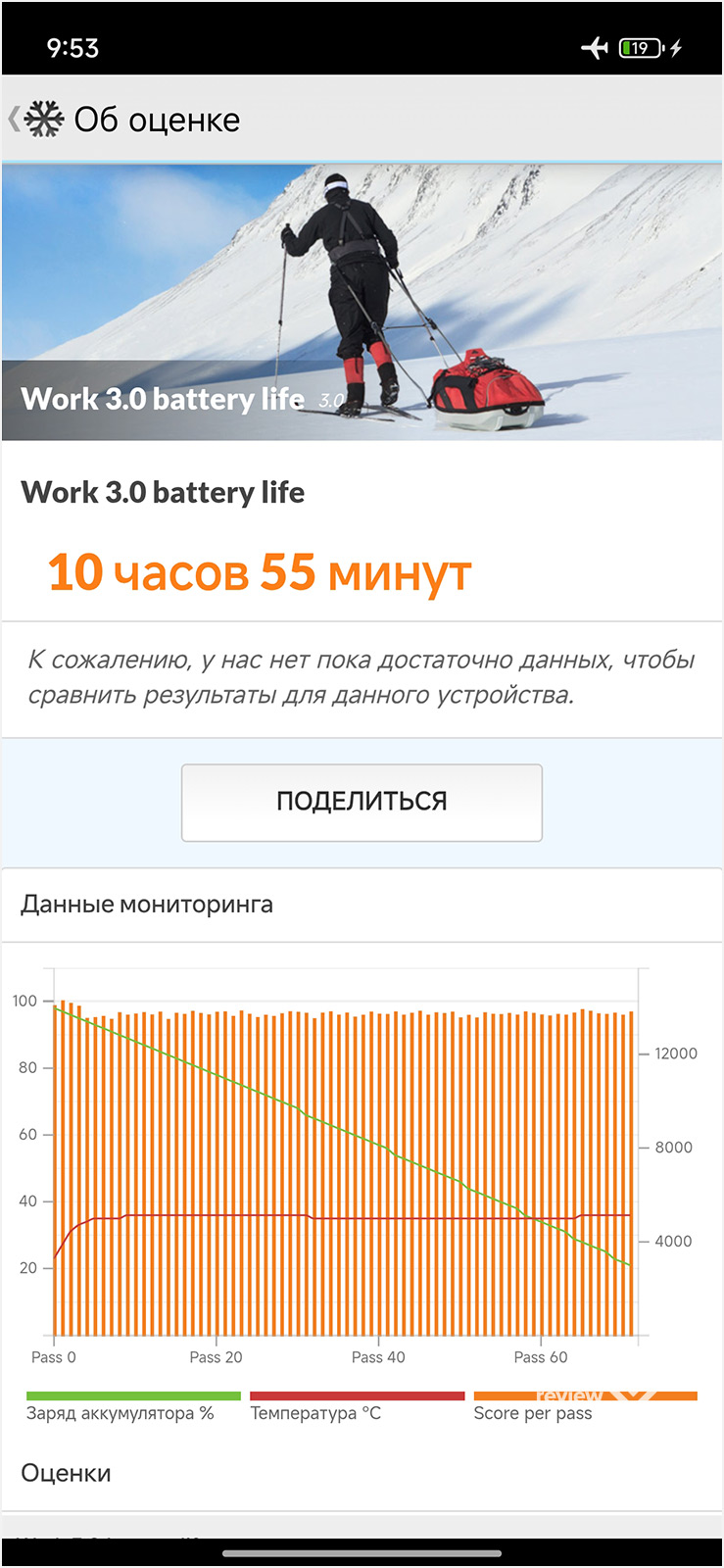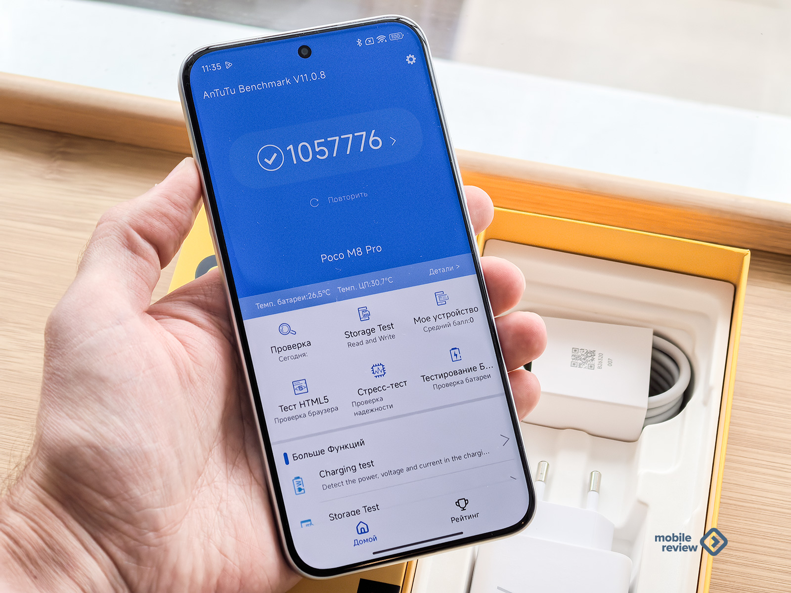 У смартфона батарея 6500 мА*ч, а в комплекте идет адаптер 100 Вт. На максимальной ручной яркости 800 нит в тесте PCMARK смартфон продержался почти 11 часов. Это хороший результат. У POCO M7 Pro 5G была батарея 5 100 мА*ч и экран 6.67 дюйма с максимальной ручной яркостью 600 нит. В аналогичном тесте у него был результат 9 часов 20 минут. У POCO M8 Pro 5G экран больше, выше уровень ручной яркости, более мощный процессор, но благодаря батарее, которая на 27% больше, он продержался на 17% дольше.