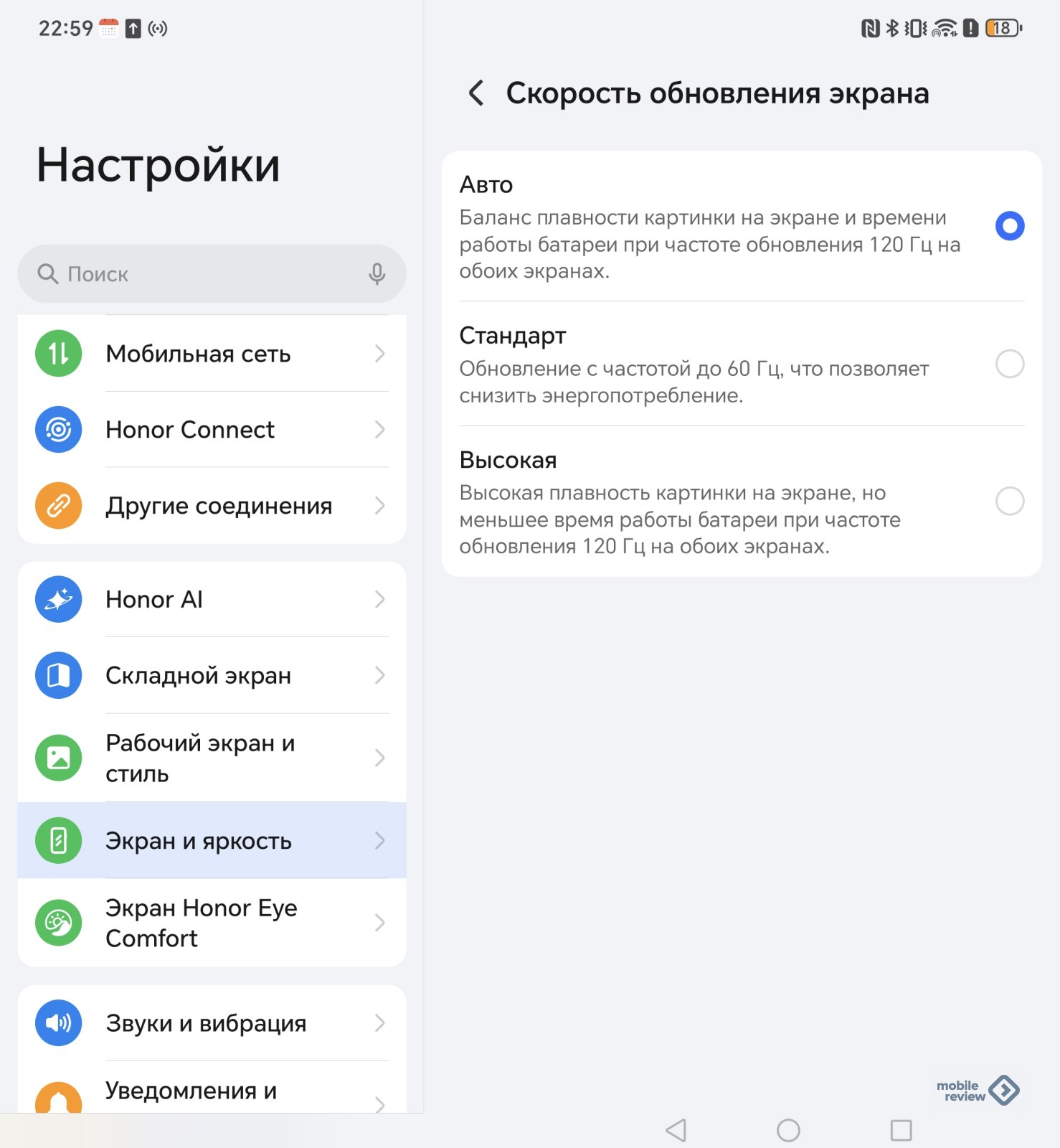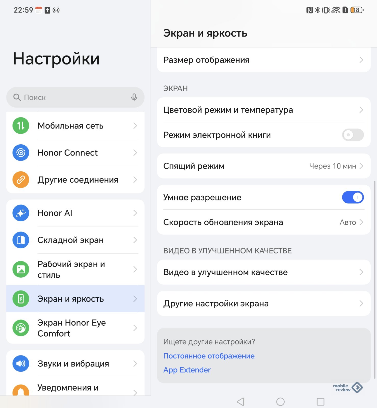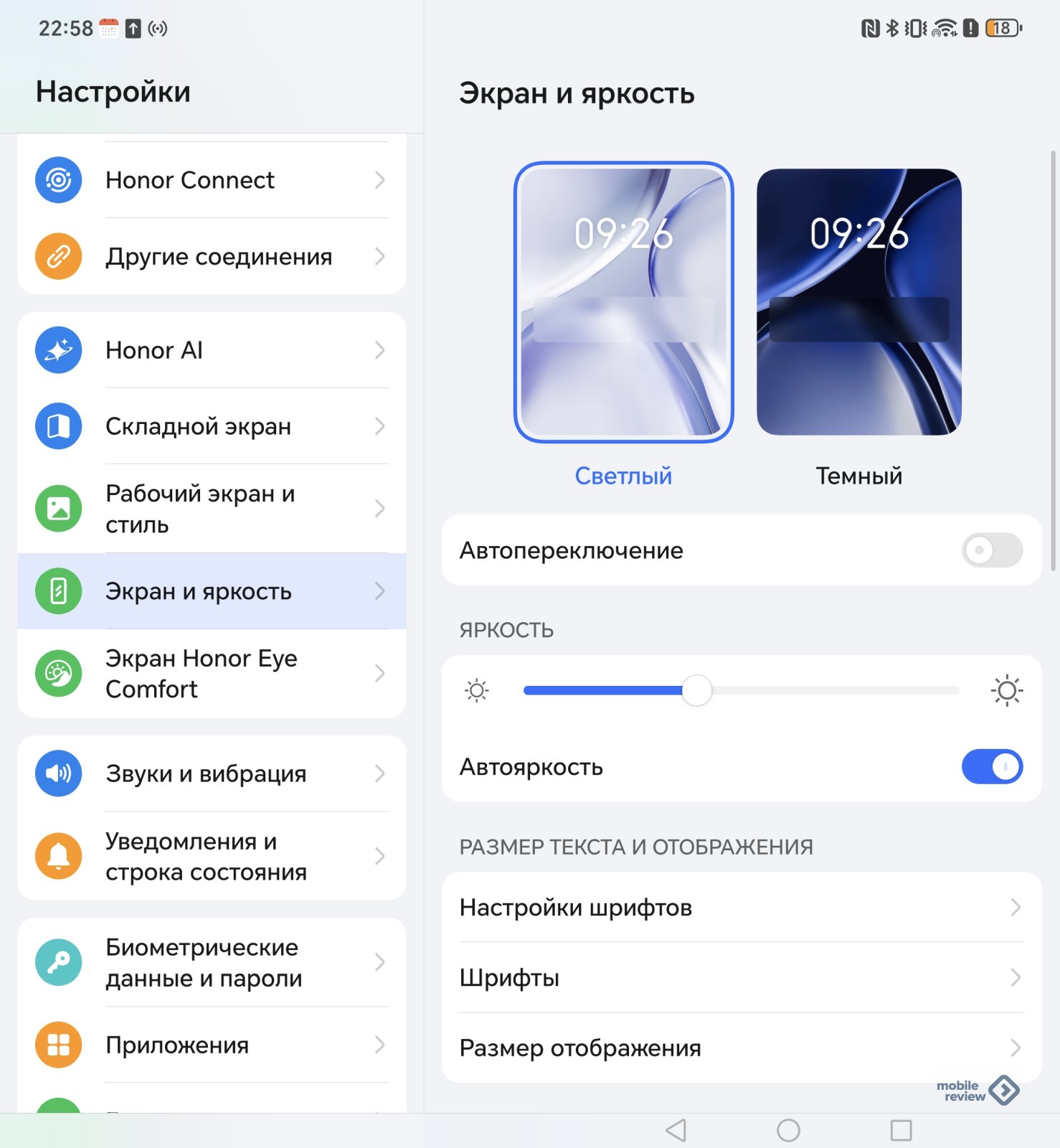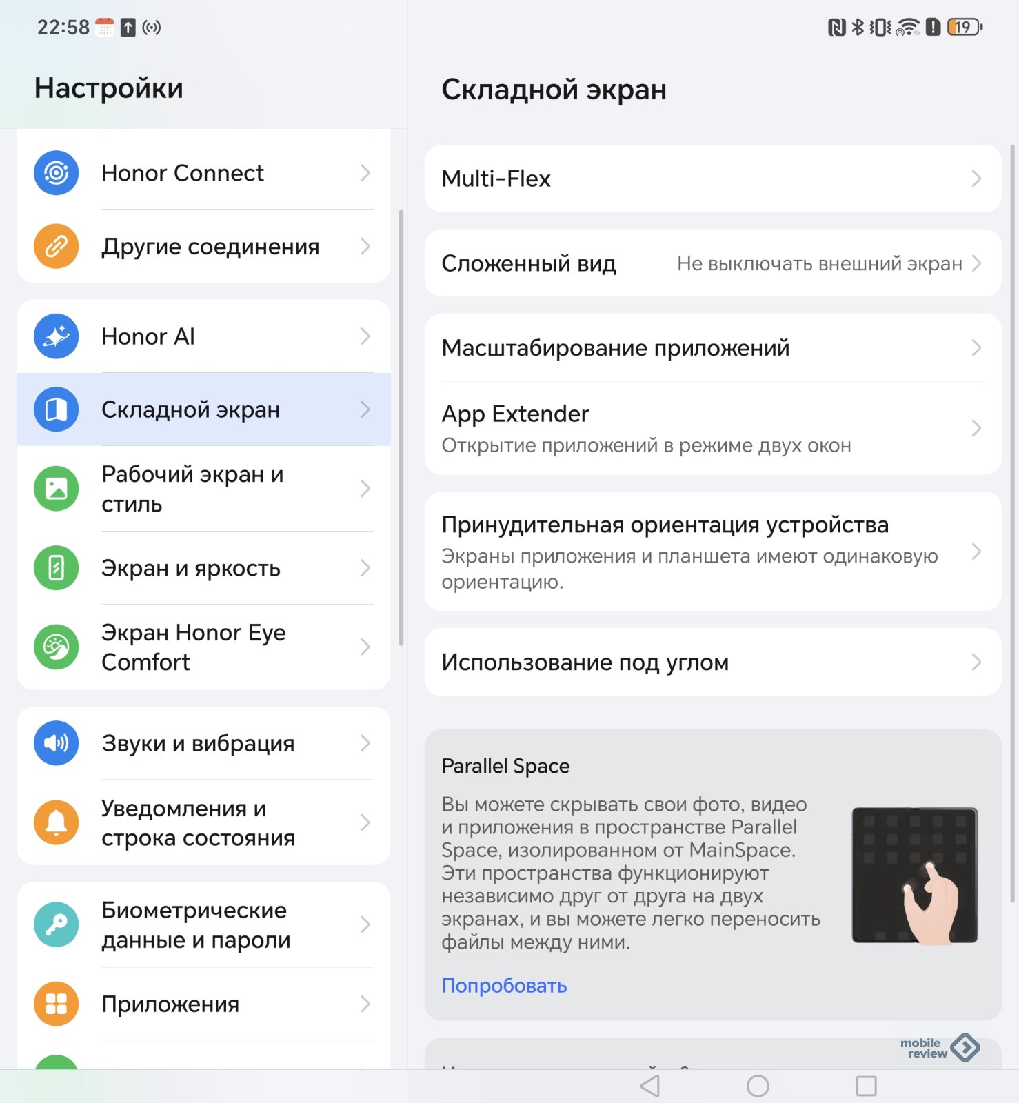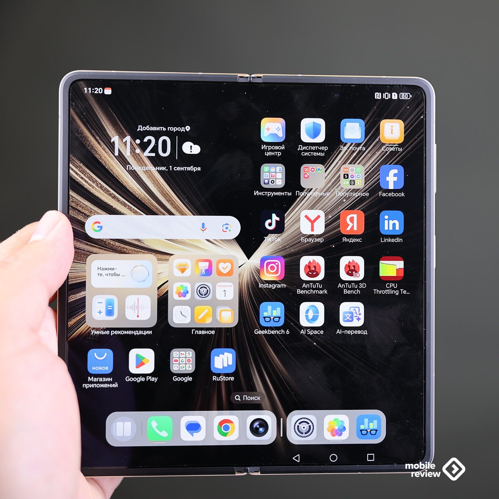 Раскрыв аппарат, вы обратите внимание на залом по центру экрана, он даже чуть больше, чем на Fold. Многие производители “исправляют” этот недостаток, а на самом деле снижают время службы экрана — при натяжении он испытывает высокие нагрузки и быстрее выходит из строя. Вопрос в том, что для вас важнее — внешняя красота или долговечность устройства. То, что в Honor использовали проверенное решение, хорошо, в повседневном использовании нет никаких изъянов, палец быстро привыкает к выемке на экране.