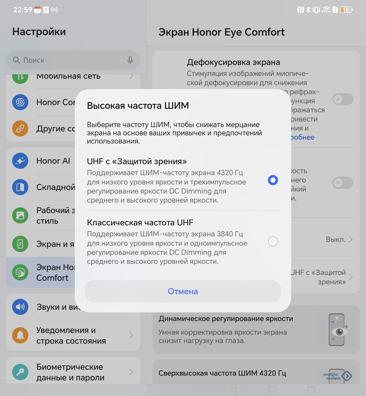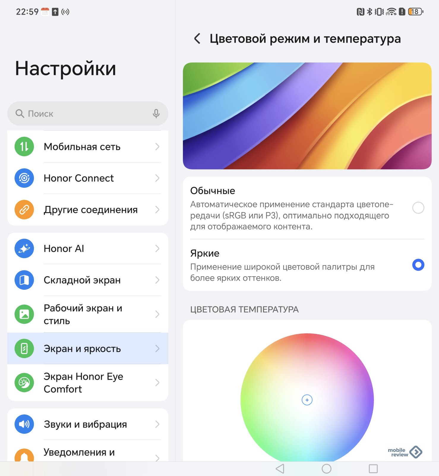 Также у Honor есть дополнительный уровень для защиты зрения, по краям экрана картинка меняется так, чтобы снижать нагрузку на зрение. Ищите в разделе Honor Eye Comfort (меню не переведено на русский).