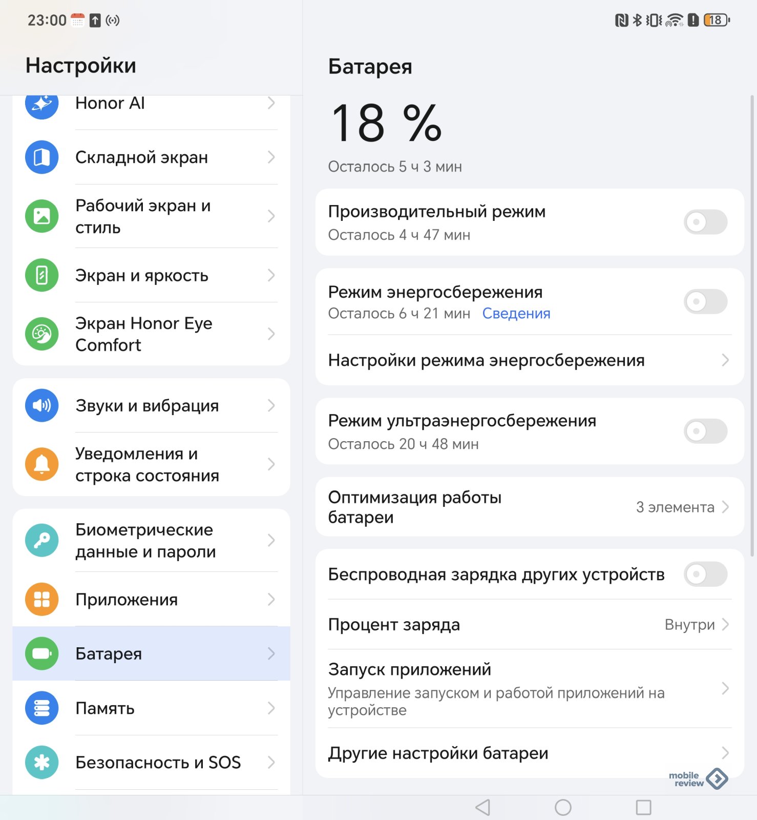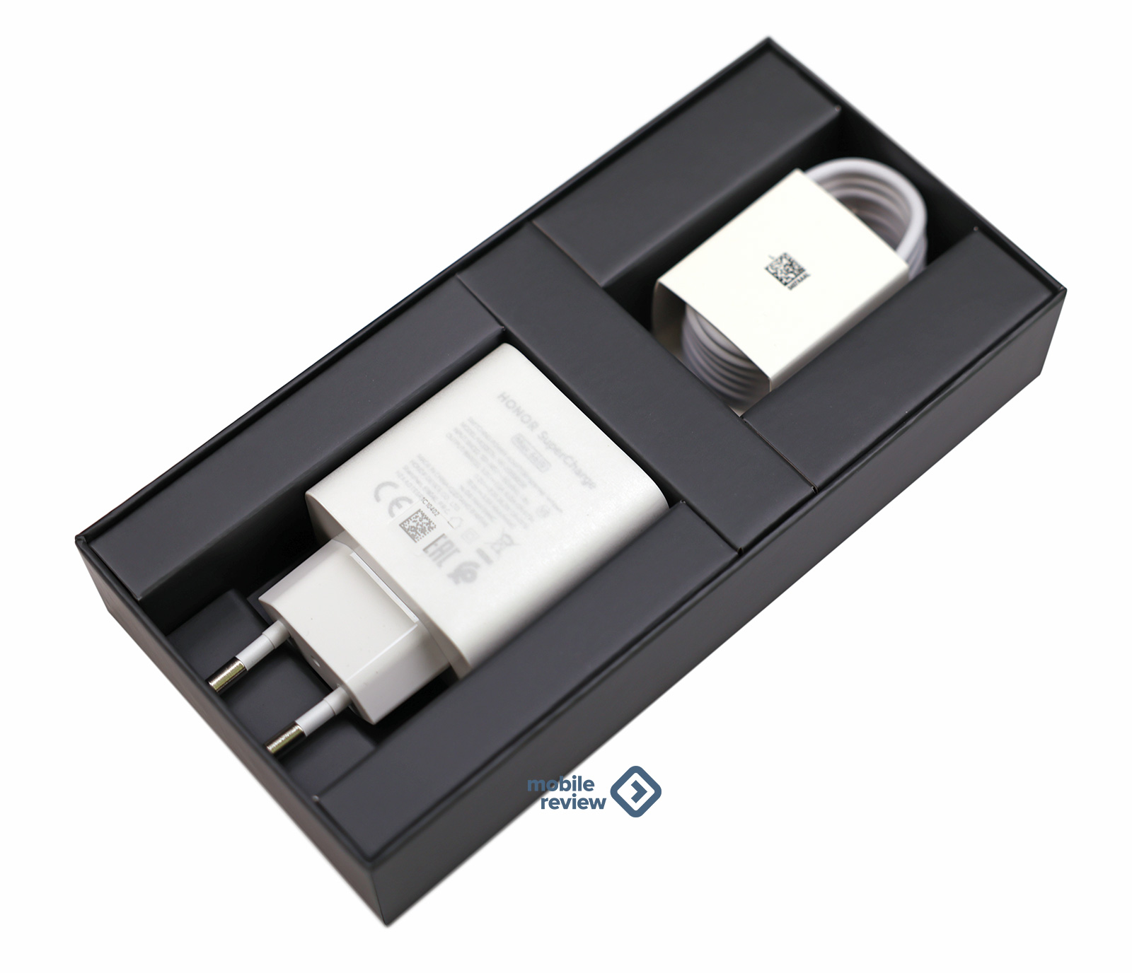 Встроенный аккумулятор кремниевый, его емкость — 5820 мАч, в комплекте зарядное устройство на 66 Вт, оно стало стандартным для моделей от Honor. Полное время зарядки — 58 минут. От того, какое зарядное устройство вы будете использовать, время зарядки не зависит.