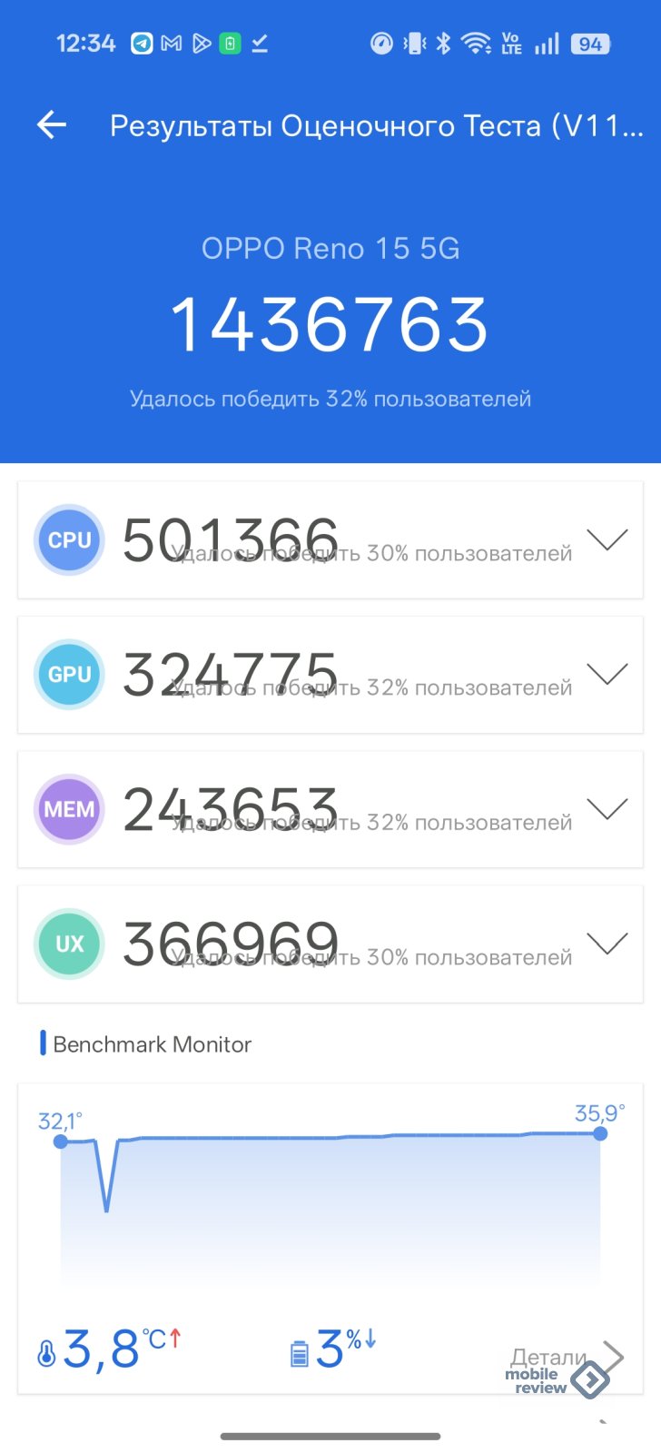 Касаемо производительности OPPO Reno15 5G, здесь разработчик очень постарался сделать сбалансированное устройство, не завышая конечную цену продукта. Модель оснастили свежим восьмиядерным чипом Qualcomm Snapdragon 7 Gen 4 с графикой Adreno 722, что на сегодня является топовым решением в среднем ценовом диапазоне. Не поскупились в OPPO и на память, так что смартфон получил 8/12 ГБ быстрой оперативной памяти стандарта LPDDR5X и 256/512 ГБ накопитель также современного стандарта UFS 3.1. Так что в тесте AnTuTu 11 новый Reno15 5G спокойно набирает более 1.4 миллиона баллов. Такой производительности вам хватит не только для беспроблемной ежедневной работы с устройством, но и для запуска современных требовательных игр. В последних корпус смартфона лишь слегка нагревается, а тепло равномерно расходится по всей поверхности. Таким образом, аппарат не перегревается и быстро остывает.