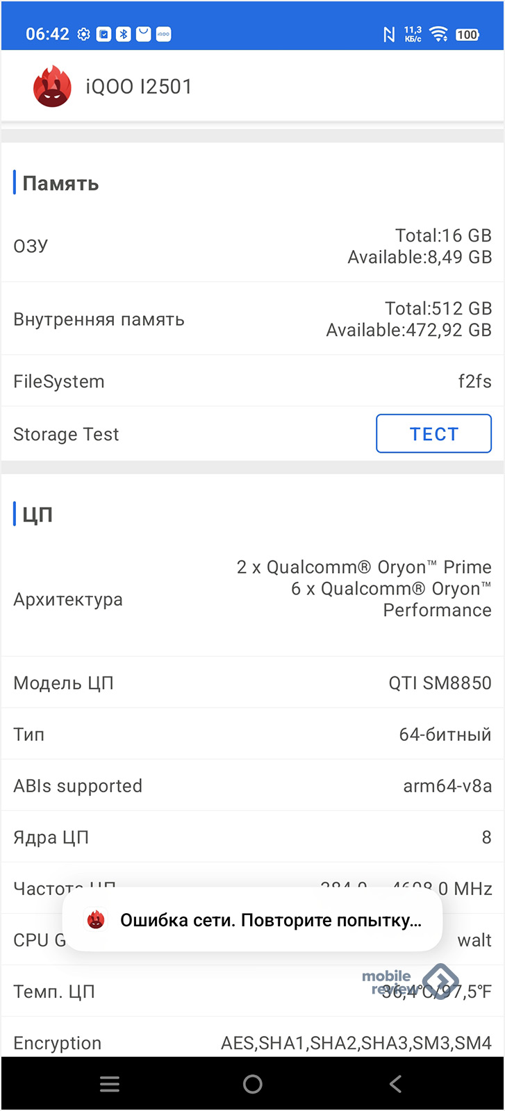У меня был аппарат на 16/512 ГБ, в России будет именно такая конфигурация. Тот же тест Antutu был заблокирован, прогнать его было можно, а вот получить результаты онлайн — нельзя. Тем не менее, один вывод можно сделать: при стандартном прогоне теста в среднем заряд батареи падал на 5-6%, аппарат нагревался до 42-43 градусов Цельсия. Температурный режим не самый жесткий, но батарейку процессор сжирает.