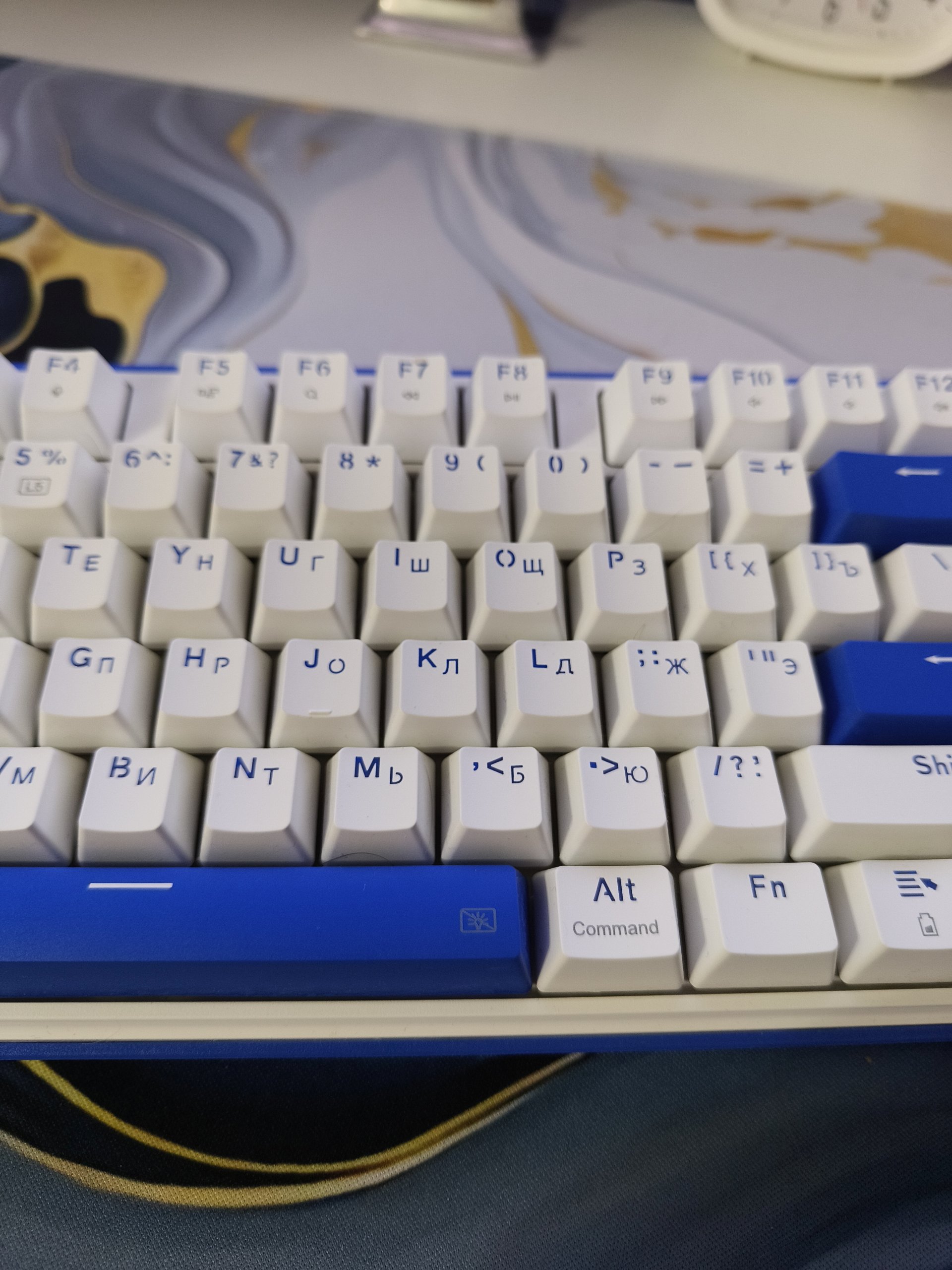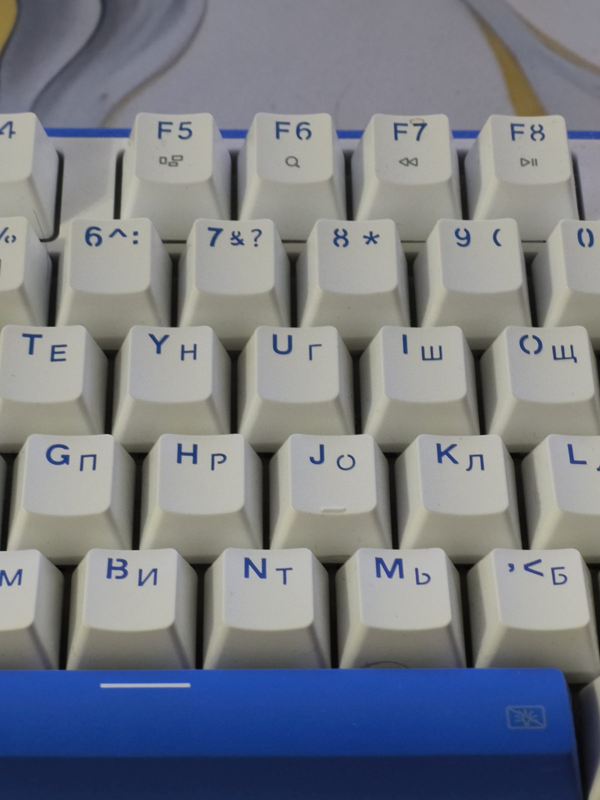 Но с кириллицей начинается настоящая головоломка. Знакомые нам буквы расположены не на своих привычных местах. Например, там, где на обычной клавиатуре за латинской P скрывается русская З, здесь оказывается буква Ю. А на месте M, где должен быть мягкий знак, у нас почему-то Б. И так далее. В общем, визуально ты не понимаешь, где что находится, да и мышечная память от ноутбука или ПК не помогает абсолютно.