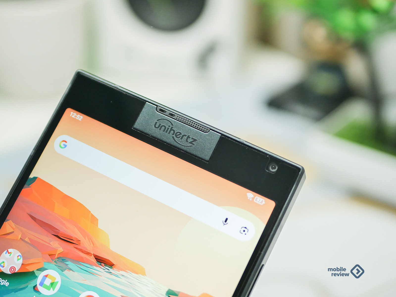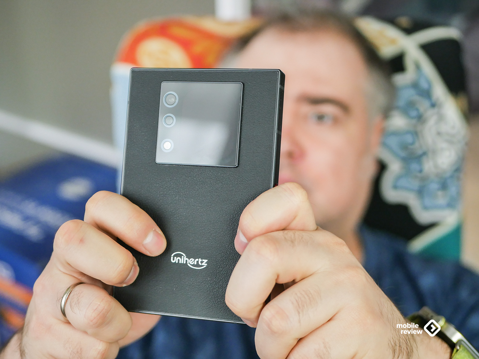 Лицевая панель, мне кажется, оформлена с претензией. Сверху красуется довольно крупная металлическая вставка размером 29х10 миллиметров. В ней прячутся речевой динамик, датчики, и даже логотип Unihertz выгравировали для солидности. Справа от этой вставки притаилась фронтальная камера — ничего необычного.
