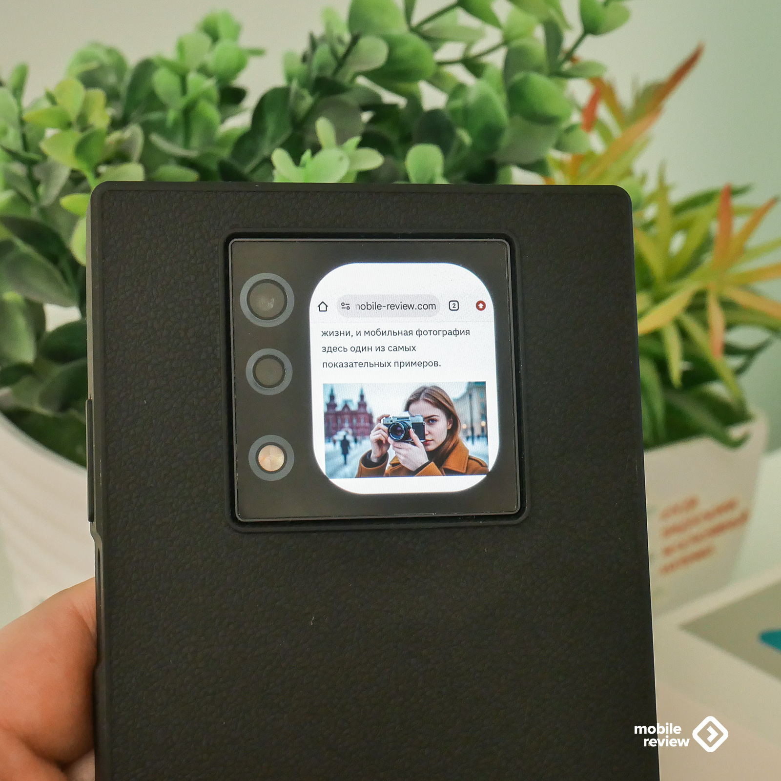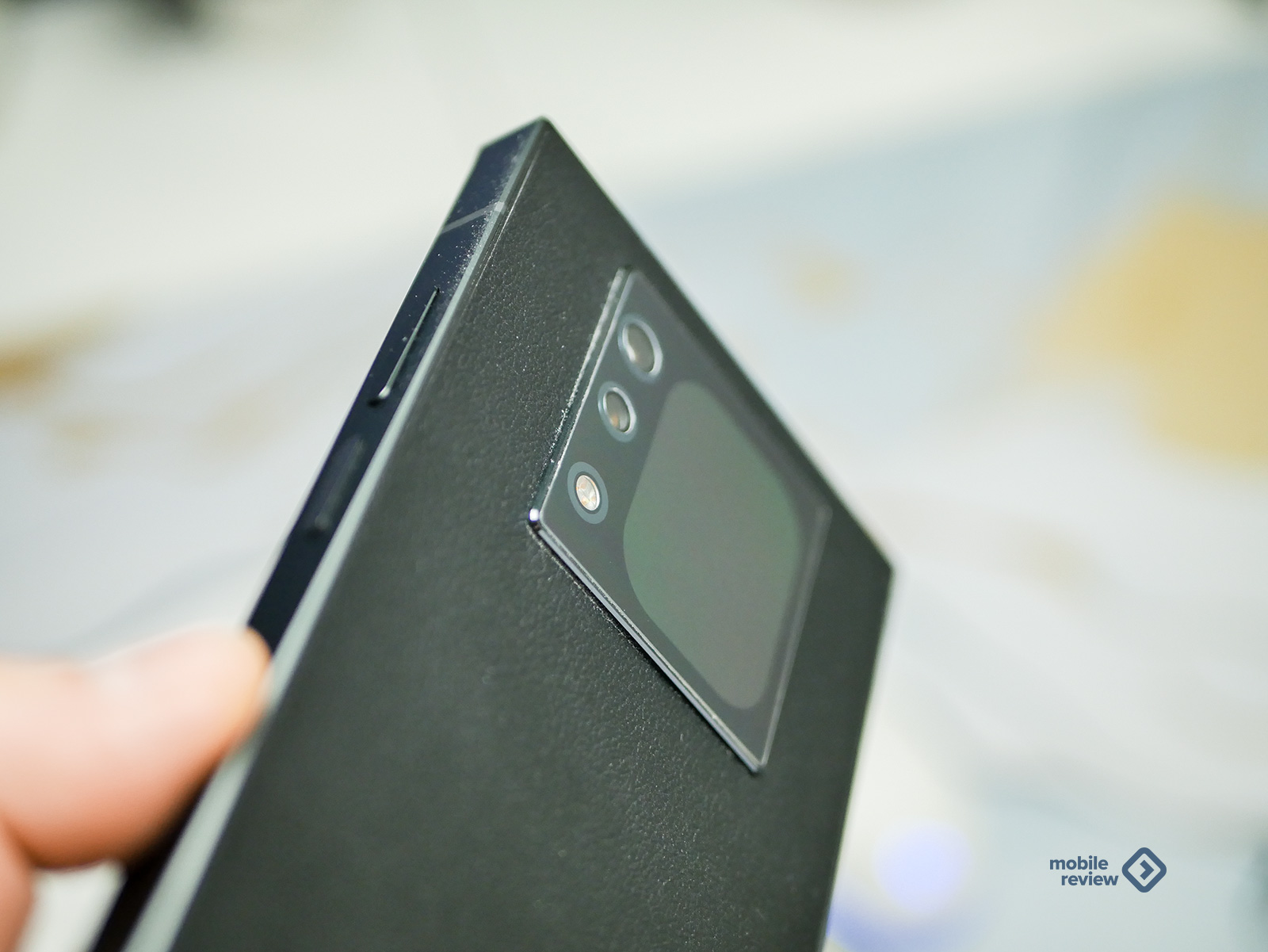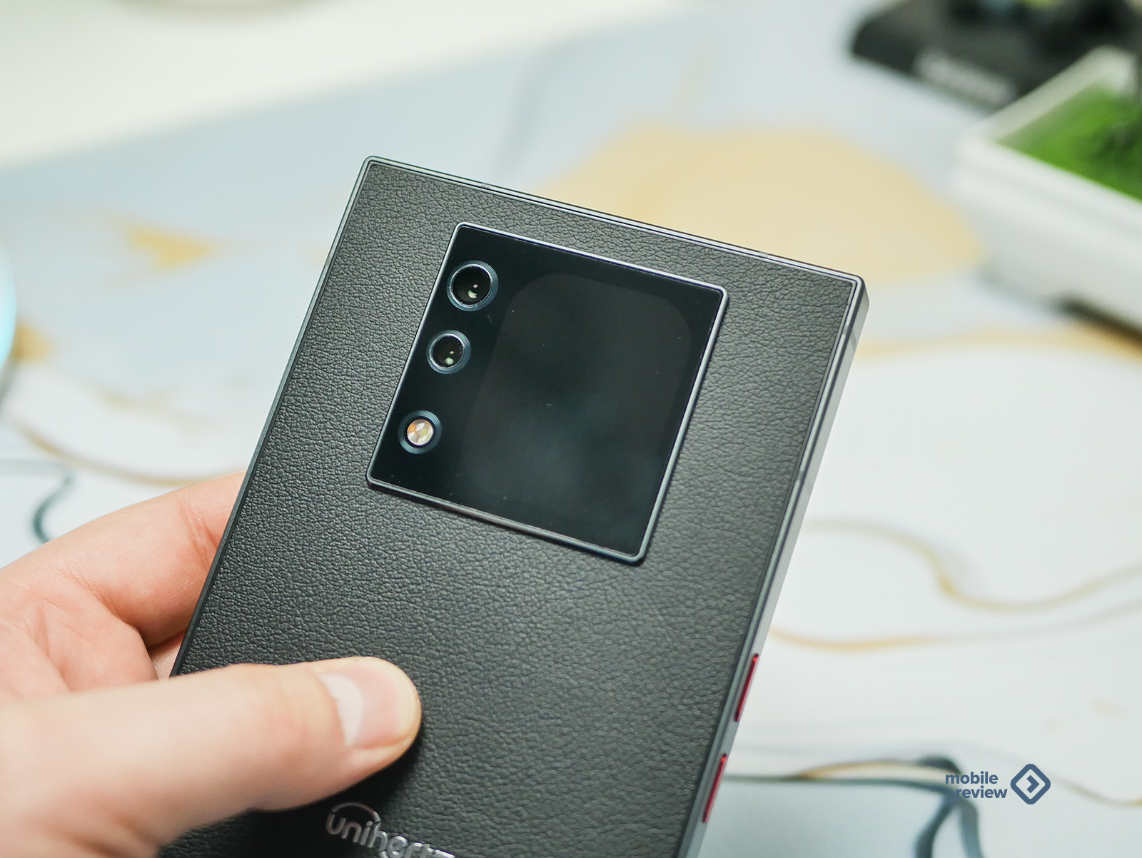 Немного смутил только блок камер на задней панели, рядом с которым притаился дополнительный экран. Он немного выступает, и углы у него намеренно сделали такими же четкими и резкими, как у всего корпуса. Понятное желание дизайнеров сохранить общую квадратную эстетику. Но на практике эти острые грани — настоящий магнит для пыли и соринок. Спасает только чехол, который, кстати, идет в комплекте. Он черный, тоже «под кожу», и в нем блок камер уже не выпирает, да и держать телефон становится чуть удобнее. Правда, чехол добавляет гаджету еще пару миллиметров габаритов со всех сторон, но тут уж, как говорится, без вариантов.