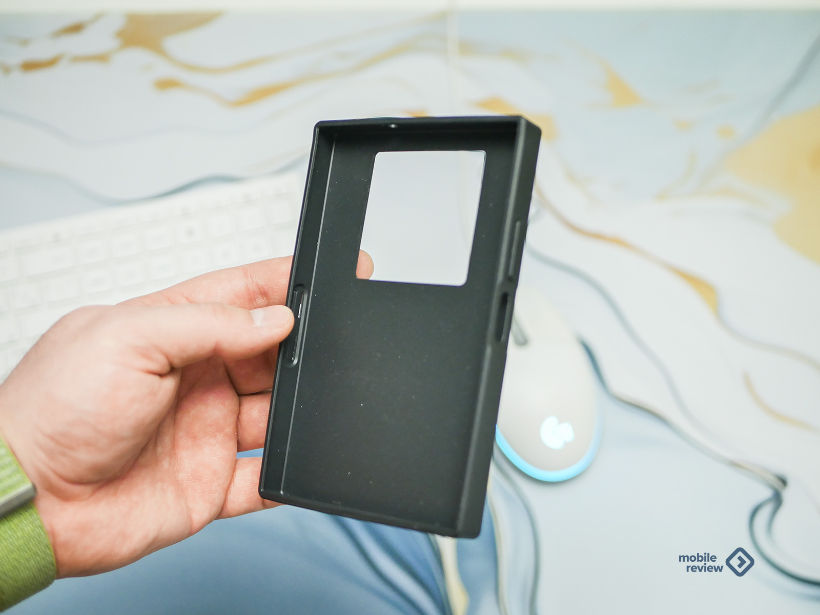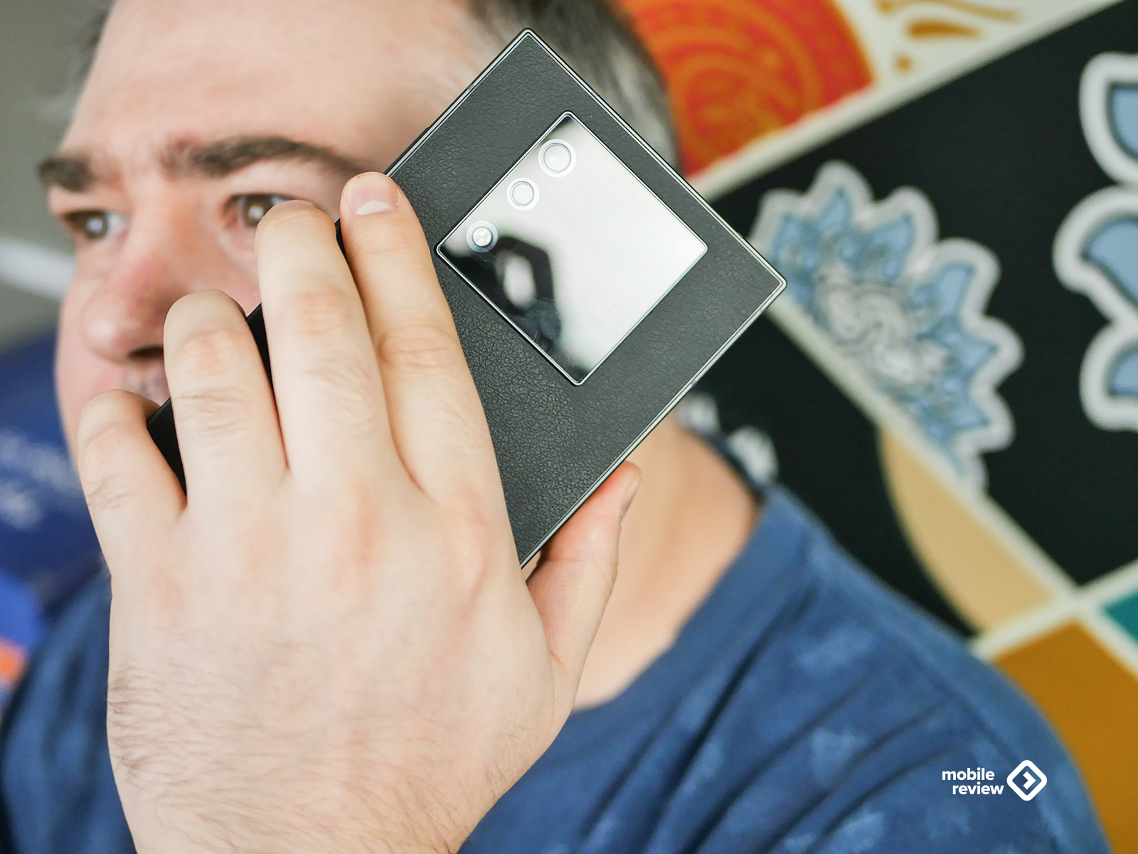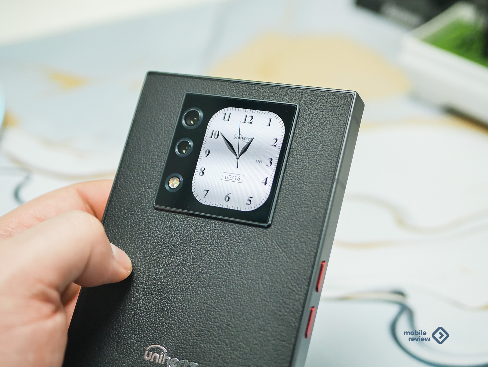 Немного смутил только блок камер на задней панели, рядом с которым притаился дополнительный экран. Он немного выступает, и углы у него намеренно сделали такими же четкими и резкими, как у всего корпуса. Понятное желание дизайнеров сохранить общую квадратную эстетику. Но на практике эти острые грани — настоящий магнит для пыли и соринок. Спасает только чехол, который, кстати, идет в комплекте. Он черный, тоже «под кожу», и в нем блок камер уже не выпирает, да и держать телефон становится чуть удобнее. Правда, чехол добавляет гаджету еще пару миллиметров габаритов со всех сторон, но тут уж, как говорится, без вариантов.