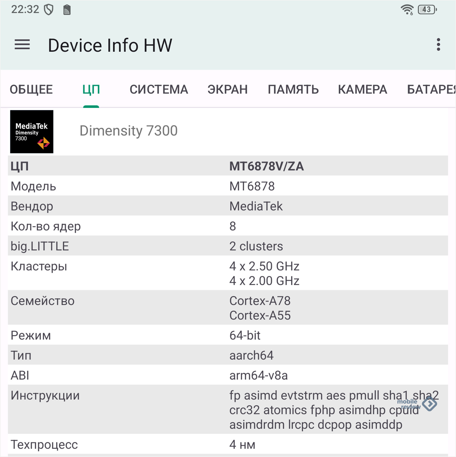 | Платформа | Процессор | MediaTek Dimensity 7300 (4 нм), 8 ядер: 4 x A78 до 2.5 ГГц + 4 x A55 до 2.0 ГГц |