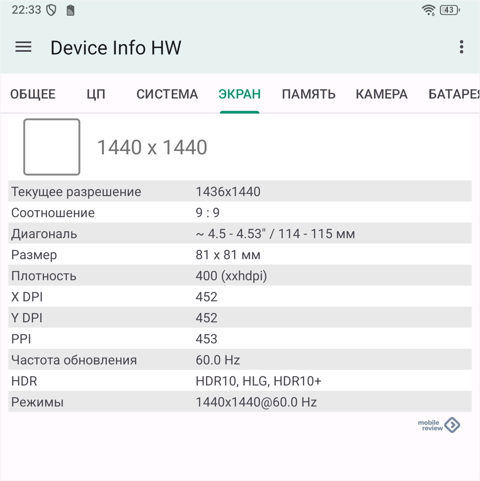 | Экран | Основной дисплей | 4.5 дюйма, IPS, 1440 x 1440 пикселей (квадратный, соотношение 1:1) |
