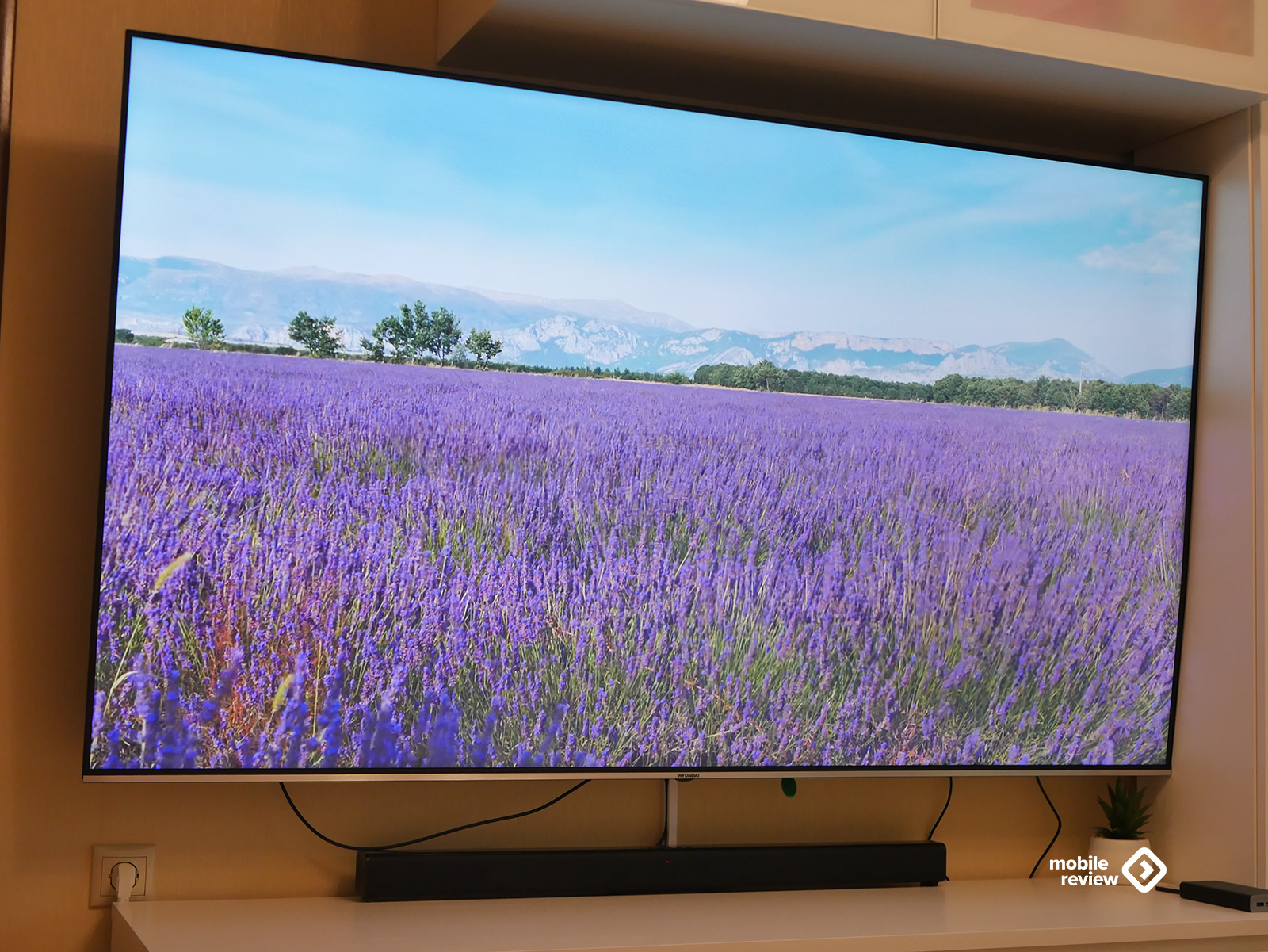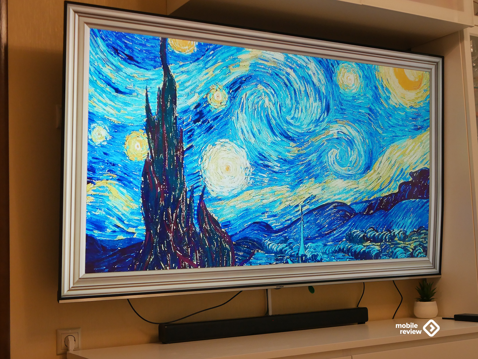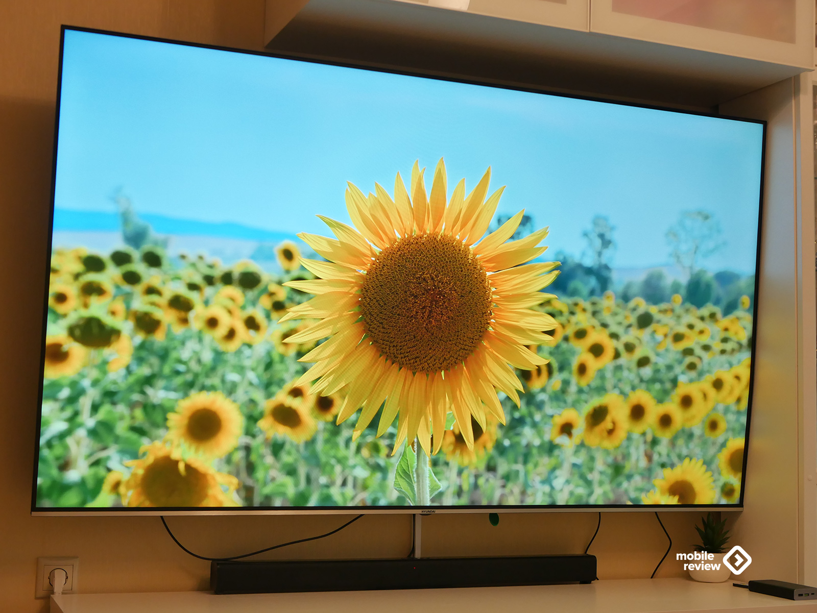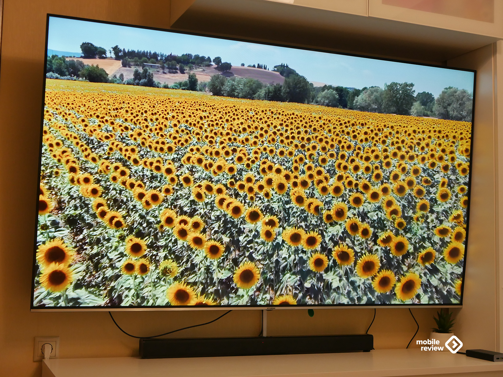 Собственно, как и любой современный телевизор, эта модель выглядит максимально минималистично. Никаких лишних деталей — просто огромный экран, где рамки почти незаметны: сверху, слева и справа всего около 8 миллиметров. Внизу — чуть толще, примерно 10 мм, да и то выглядит аккуратно: серебристая полоска «под металл» с маленькой надписью Hyundai по центру. Надпись, кстати, совсем не мешает — глаз за нее не цепляется, и во время просмотра о ней вообще не вспоминаешь.