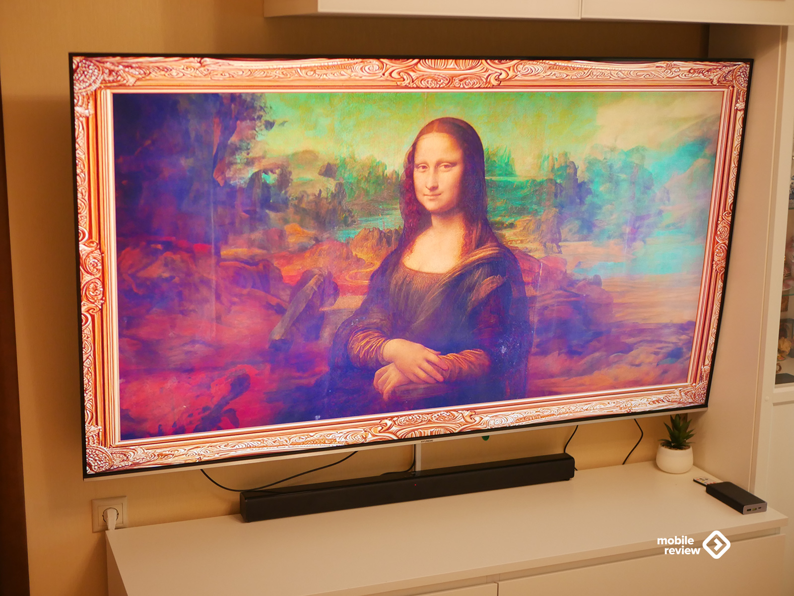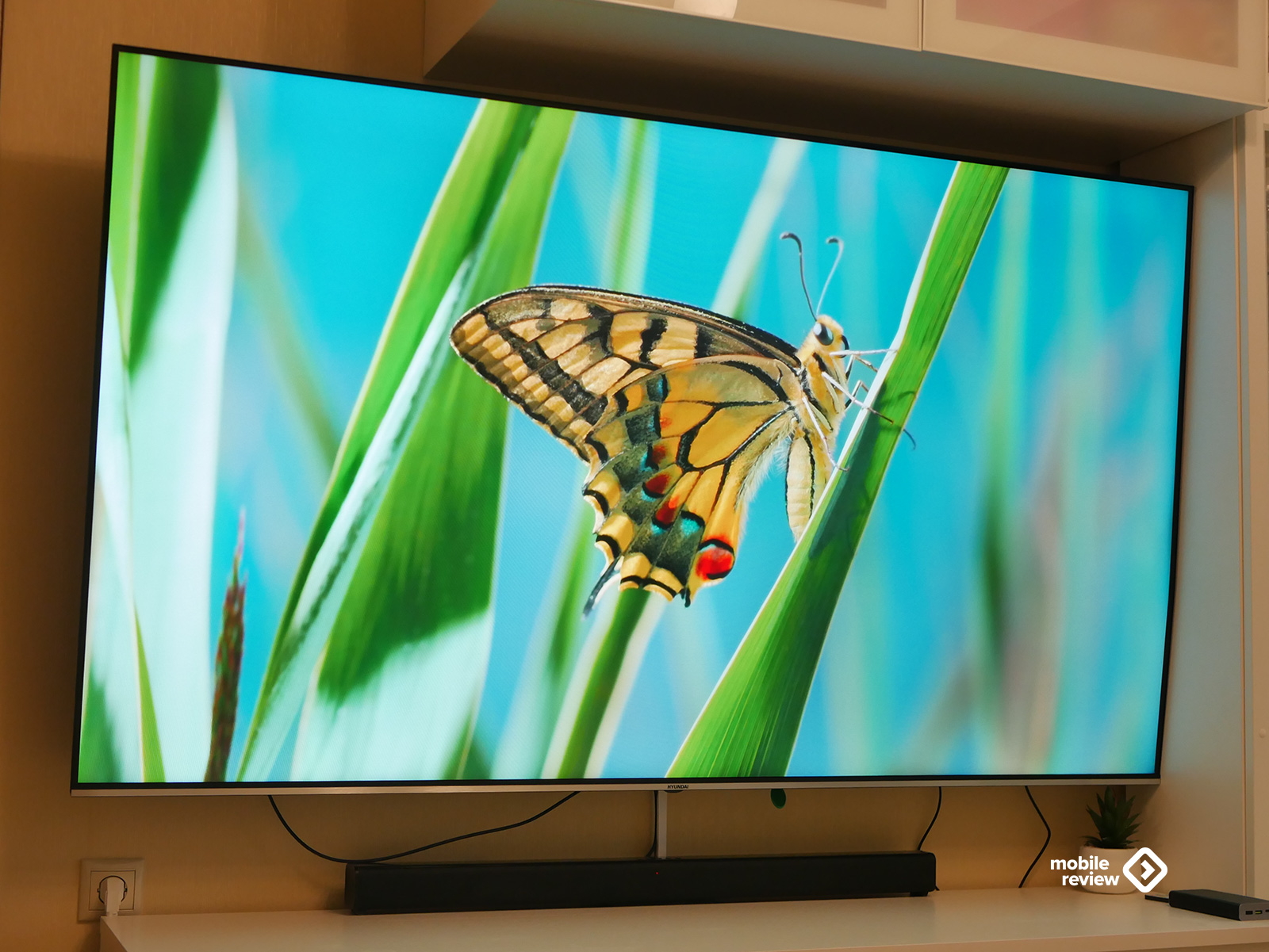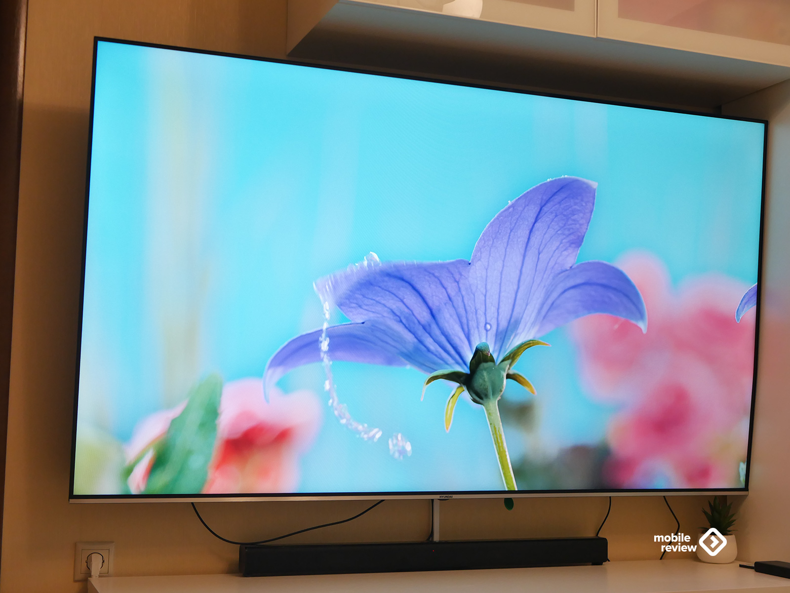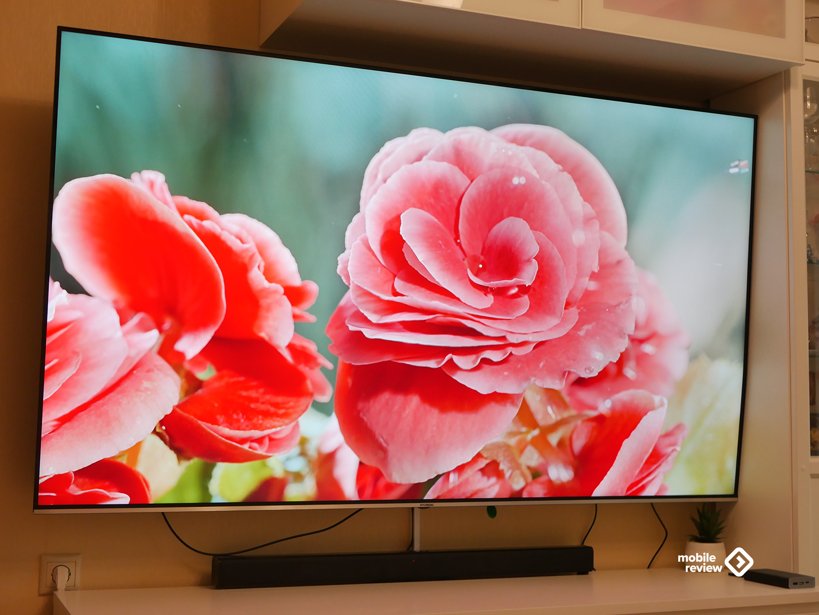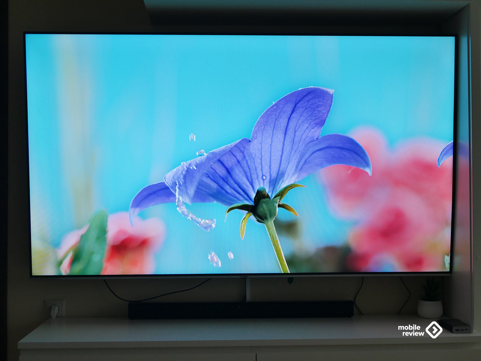 Собственно, как и любой современный телевизор, эта модель выглядит максимально минималистично. Никаких лишних деталей — просто огромный экран, где рамки почти незаметны: сверху, слева и справа всего около 8 миллиметров. Внизу — чуть толще, примерно 10 мм, да и то выглядит аккуратно: серебристая полоска «под металл» с маленькой надписью Hyundai по центру. Надпись, кстати, совсем не мешает — глаз за нее не цепляется, и во время просмотра о ней вообще не вспоминаешь.