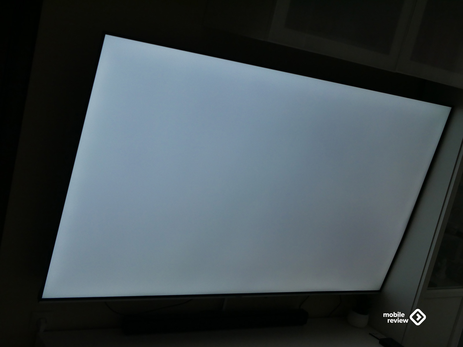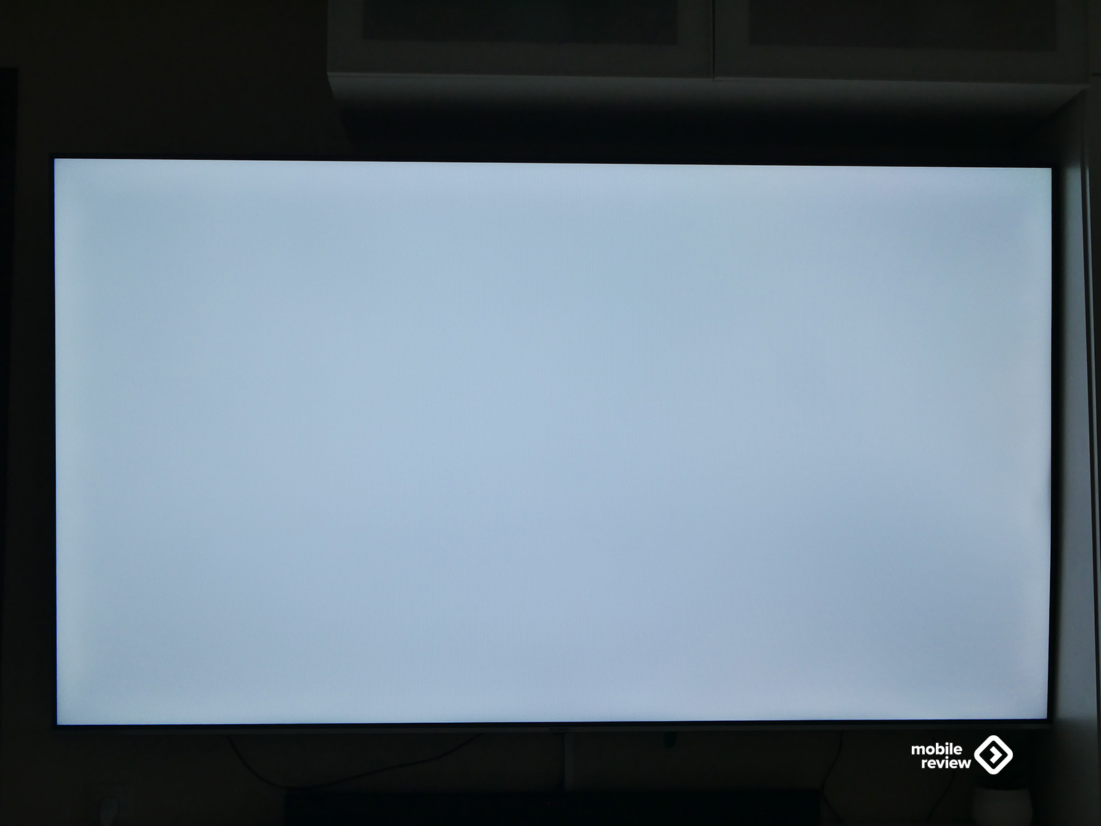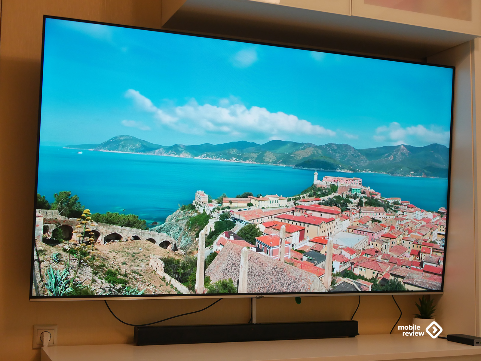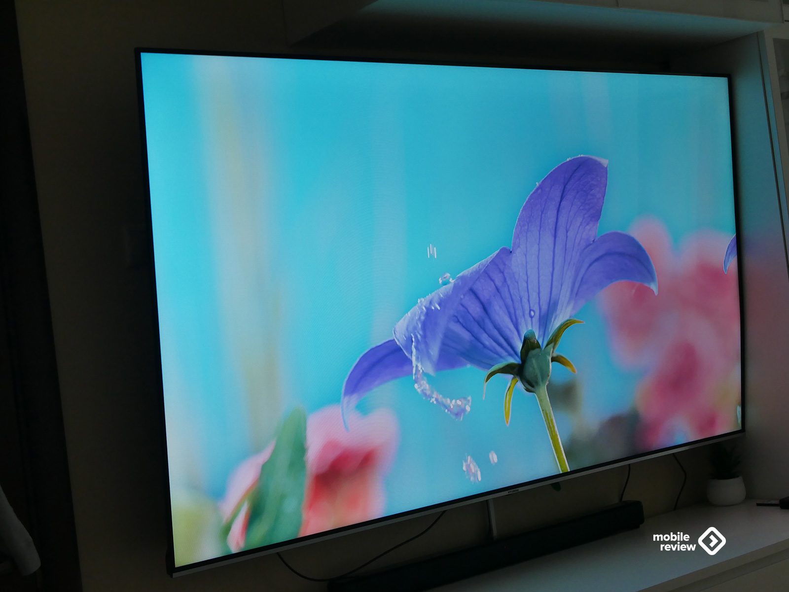 Собственно, как и любой современный телевизор, эта модель выглядит максимально минималистично. Никаких лишних деталей — просто огромный экран, где рамки почти незаметны: сверху, слева и справа всего около 8 миллиметров. Внизу — чуть толще, примерно 10 мм, да и то выглядит аккуратно: серебристая полоска «под металл» с маленькой надписью Hyundai по центру. Надпись, кстати, совсем не мешает — глаз за нее не цепляется, и во время просмотра о ней вообще не вспоминаешь.