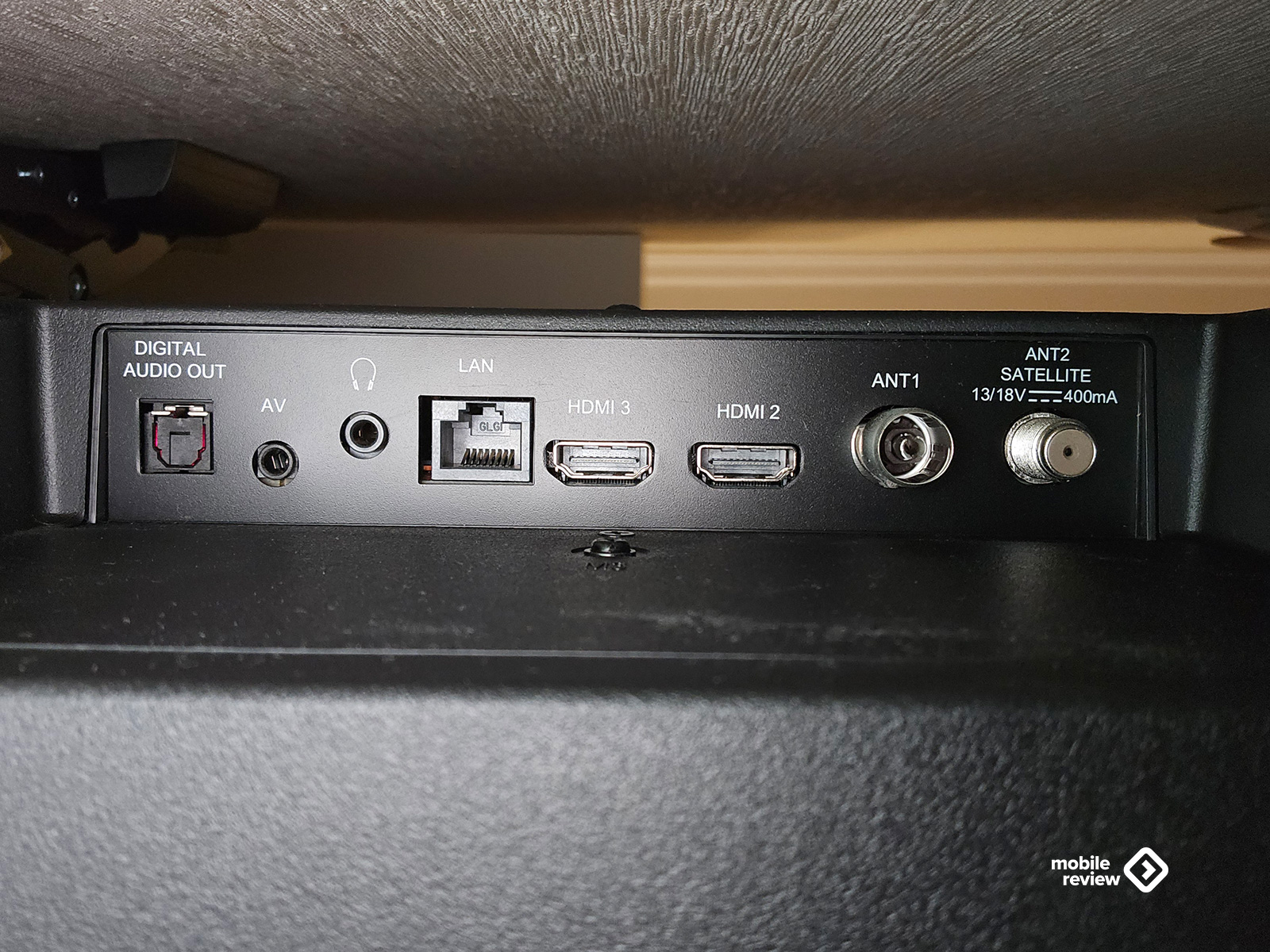 А вот ниже, в самом низу с левой стороны, уже собрались все остальные разъемы: два HDMI 2.1, порт RJ-45 для сети, 3,5-миллиметровый аудиовыход, оптический S/PDIF, AV-вход, разъем для обычной антенны и для спутникового кабеля. Тут, на мой взгляд, не самое удачное решение — расположено все довольно низко, и если телевизор висит на стене, подлезть туда без акробатических навыков практически невозможно. Думаю, проще подключить все заранее, пока телевизор еще стоит на полу или на тумбе.