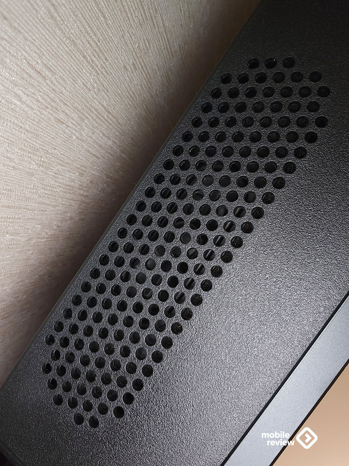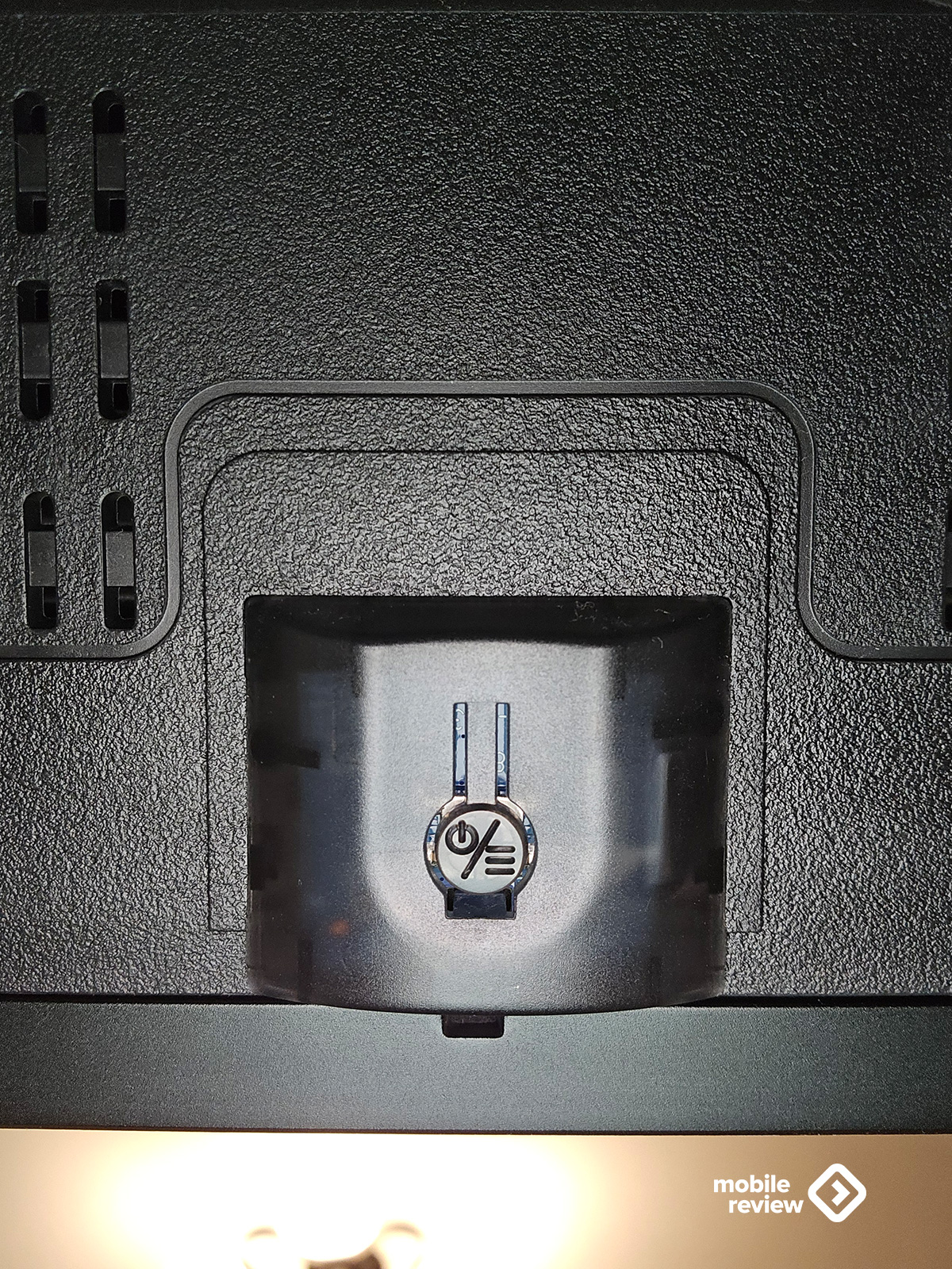 Внизу, по центру корпуса, есть небольшой выступ — там расположены механическая кнопка питания и световой индикатор. Решение простое, но продуманное: кнопка на ощупь понятна, а светодиод не светит в глаза ночью, не мешает и не превращает комнату в дискотеку.