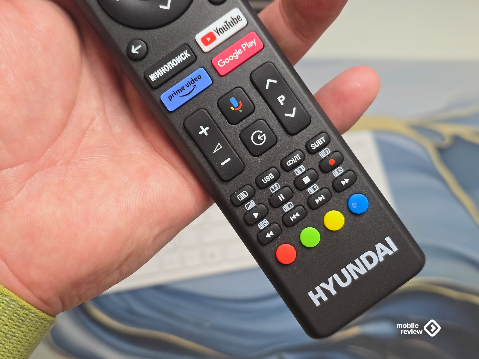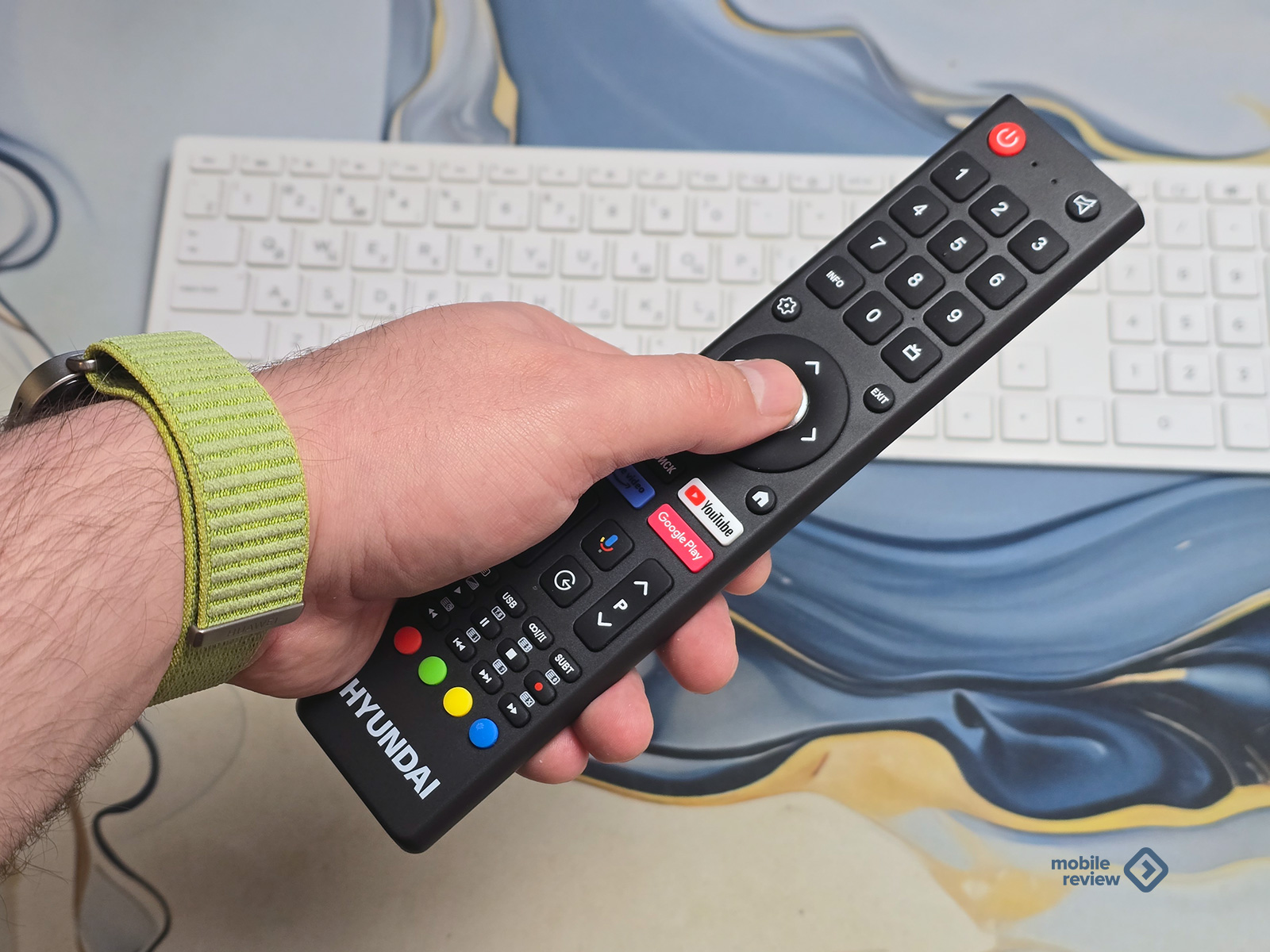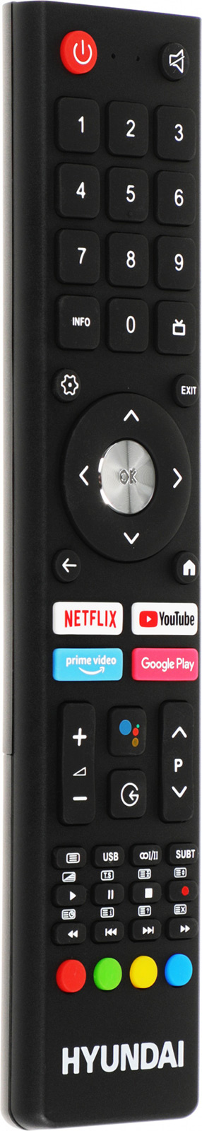 Пульт от телевизора Hyundai, как мне кажется, оказался оптимальным компромиссом. Он легкий, узкий, довольно длинный и удобно лежит в руке. Самое важное для меня — чтобы кнопки были выпуклыми, а не утопленными в корпус. Здесь это реализовано отлично: кнопка «ОК» чуть утоплена и имеет другую текстуру, что помогает быстро ориентироваться даже на ощупь.