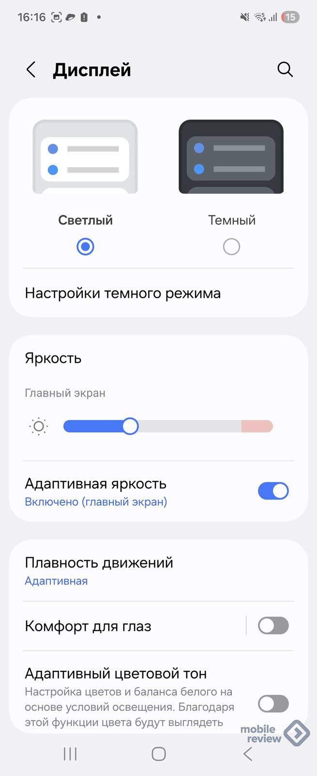 Традиционно есть фильтр синего цвета, темная тема, в том числе возможность установить работу по расписанию. Адаптивная яркость экрана подстраивается под ваши предпочтения. В ручном режиме вы можете выставить яркость до 700 нит, в автоматическом режиме она достигает 2600 нит в пике.