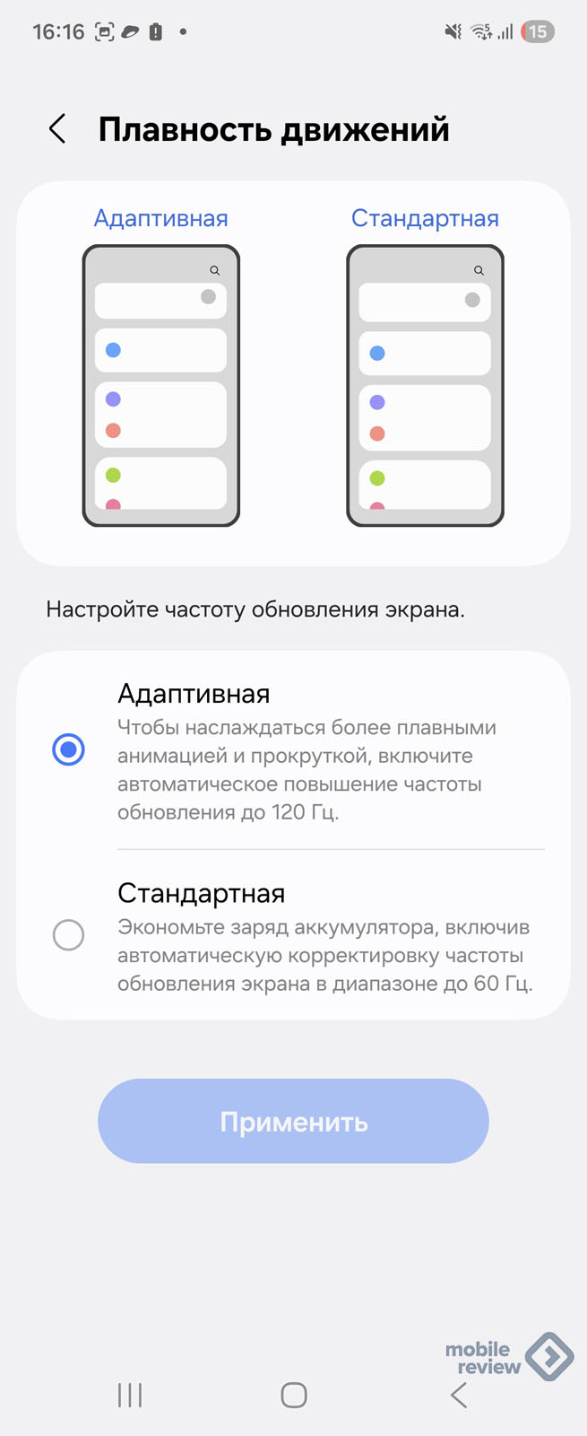Адаптивный режим подстраивается под тот контент, что на экране (частота до 120 Гц). Не менял настройки, использовал 120 Гц всегда, так приятнее. На аккумуляторе этот режим сказывается, но потребление вырастает не более чем на 10% (в играх может доходить до 15%).