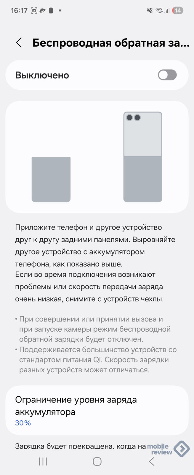 Беспроводная зарядка поддерживает мощность до 15 Вт, что позволяет зарядить смартфон за 145 минут. Обратная реверсивная зарядка позволяет подзарядить аксессуары или другой смартфон, мощность до 4.5 Вт. Заряжать аксессуары можно при закрытом аппарате, но нужно четко позиционировать другое устройство. И вот тут начинаются проблемы, достаточно чуточку сдвинуть другой аксессуар, и зарядка прекратится. Это очень неудобно.