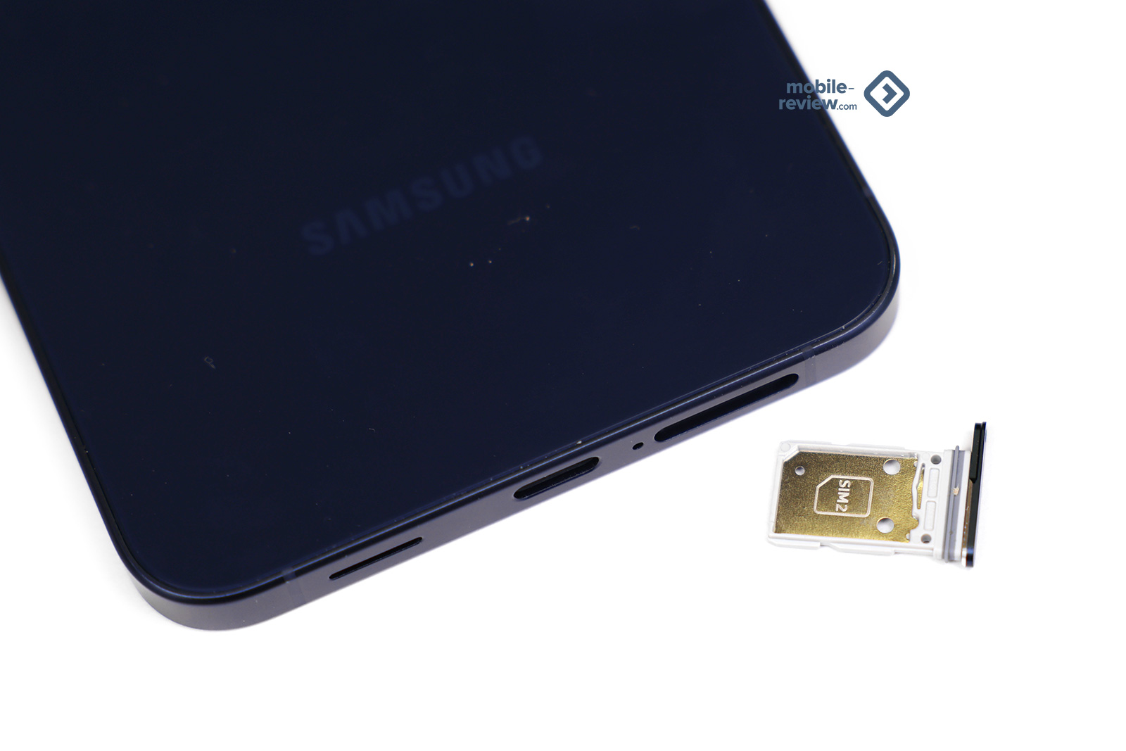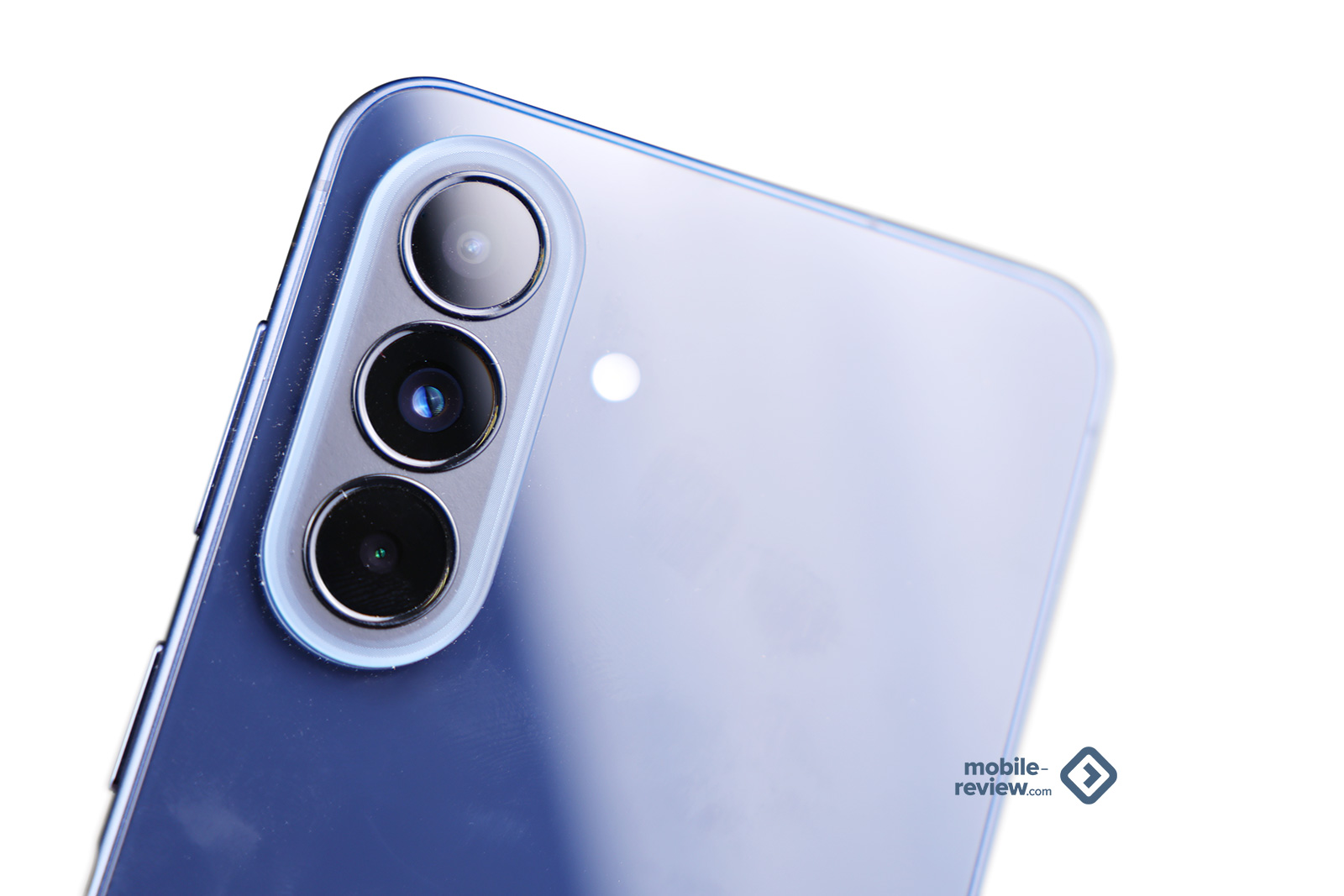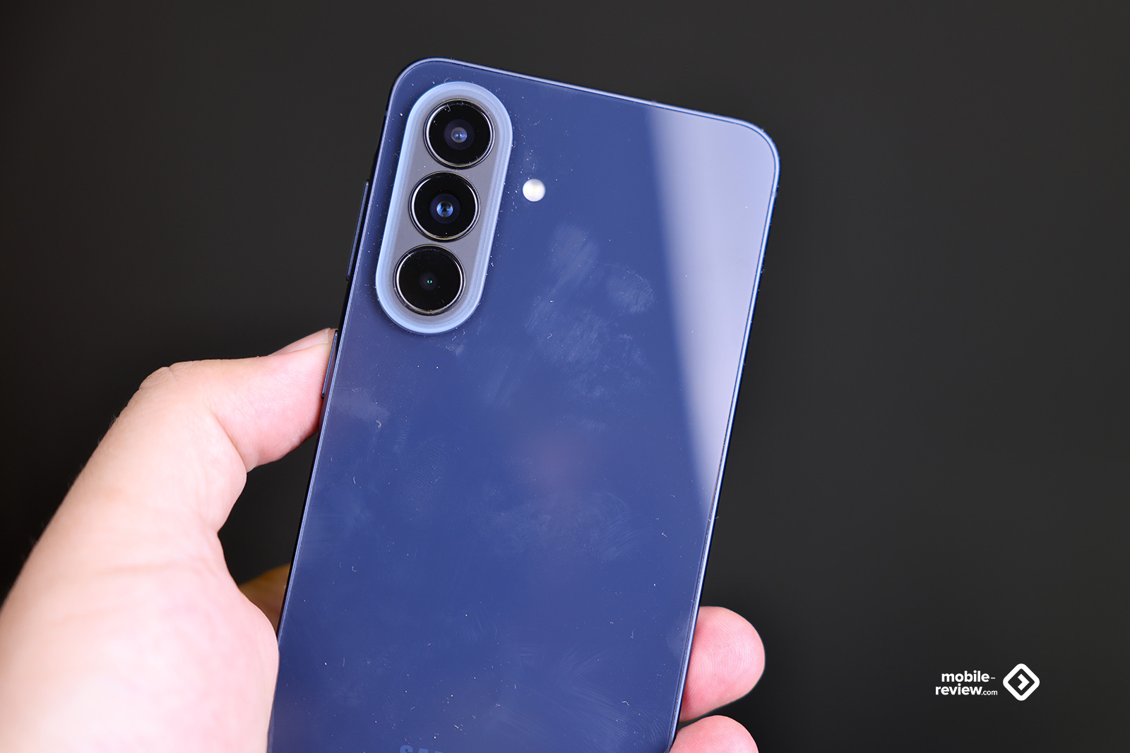 Боковая грань матовая, в цвет корпуса, а вот стекло задней панели маркое, поскольку темное. Плюс в нем отражается практически все что угодно, этим А-серия отличается от флагманов S-серии, они матовые. Такое ощущение, что эту разницу создавали осознанно, чтобы вы не перепутали один аппарат с другим, посмотрите на сравнение с S26+.