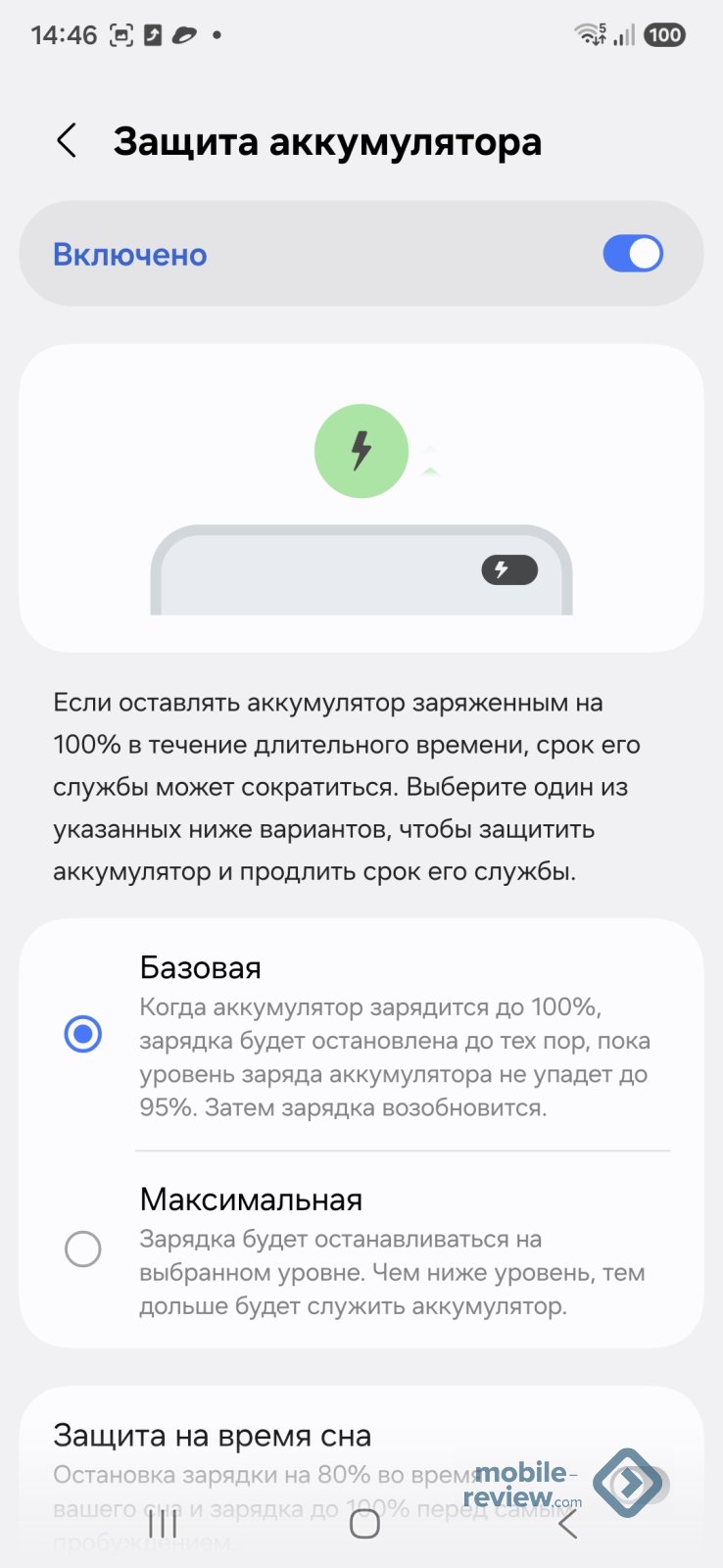 В Samsung переработали подход к батарее, разрешив больший нагрев при зарядке, что дает чуть больший заряд на начальном этапе. Но затем температура растет до 39 градусов Цельсия, и скорость зарядки падает. В сравнении с предыдущим А56 общее время зарядки остается одинаковым. Ставка сделана на долговечность батареи. При этом такой формат зарядки идет без дополнительных ограничений в настройках, также вы можете выставить ограничение в процентах от общей емкости.