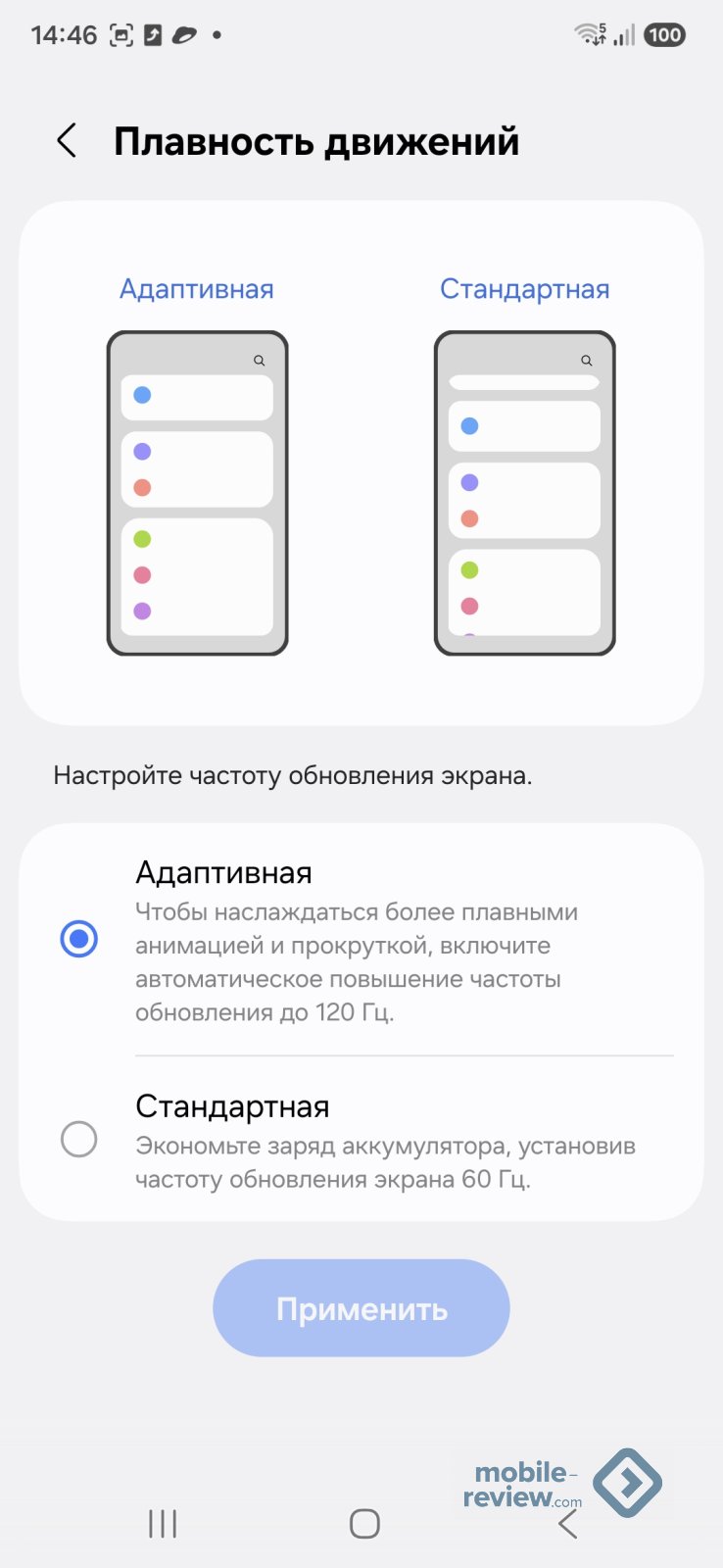 В отличие от флагманов, тут не LTPO-матрица, то есть регулировка частоты идет от 60 Гц. На практике это значит, что энергопотребление дисплея выше, чем во флагманах, но особой роли в большинстве сценариев использования это не играет.