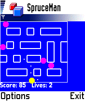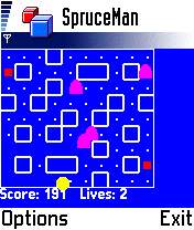 Spruce Man не что иное как клон Pac-Man для мобильных телефонов. Ваша задача «съесть» все точки, избегая привидений, которые, как и вы находятся в лабиринте. В каждом лабиринте есть несколько красных квадратов, «съев» которые, вы можете некоторое время не боятся привидений. К сожалению, в игре всего 2 уровня, возможно, это изменится в будущих версиях. Звука в игре нет.