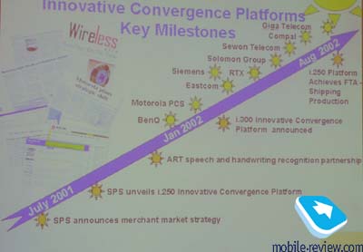 На прошедшей пресс-конференции (см. новость о заводе «Марион») встретился любопытный слайд, в нем перечислены компании, использующие платформу i250 от Motorola для создания своих продуктов, в частности, сотовых телефонов. На картинке особняком стоит компания Siemens, это объясняется тем, что она единственная лицензировала платформу i300, предназначенную для создания аппаратов третьего поколения.
