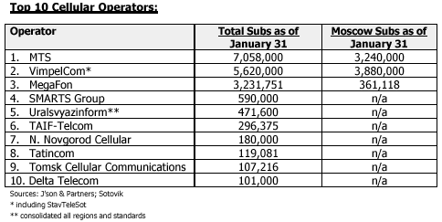 J’son & Partners и Сотовик опубликовали статистику рынка предоставления услуг сотовой связи за январь 2003 года. Согласно ей количество абонентов в России (GSM, TDMA/DAMPS,IS-95) выросло на 6.9% в январе и достигло 19,28 млн. Прирост составил 1,25 млн абонентов. Процент населения России, пользующегося услугами мобильной связи сотавил 13,4. Уровень проникновения на Московской лицензионной территории преодолел отметку 50% в конце месяца.