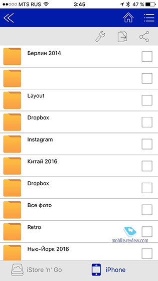 Примечательно, что даже содержимое вашего айфона можно посмотреть в файловом менеджере, правда, доступны только фотографии и документы, но даже альбомы отсортированы по папкам, это удобно. В отличие от прошлого гаджета, эта флешка не умеет воспроизводить сложные видеофайлы сама и не дает возможности экспортировать их в совместимые приложения, например, в видеоплеер Infuse.