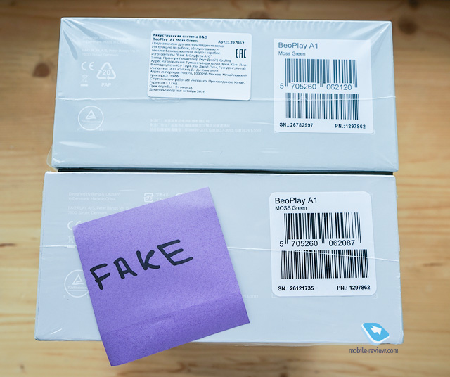 Обзор подделки Bang&Olufsen BeoPlay A1Сразу нужно сказать о двух моментах. Я бы, может, и не стал даже тратить время на подделку, но в случае с этим «произведением» пришлось сделать отметки на упаковке и корпусе, чтобы не путать с оригиналом. Учитывая, что я хорошо знаю оригинальную A1, представьте, как может попасть потребитель: если уж визуально удается ввести в заблуждение журналиста, то обычный человек просто купит и разочаруется в Bang&Olufsen навсегда. Я не буду говорить, где именно было куплено устройство, потому что так бороться с гидрой бесполезно. Отрубишь одну голову – вырастут две. Покупайте хорошие вещи в хороших местах, и тогда они вас будут радовать. Главное, не пытайтесь сэкономить пару тысяч при покупке подобных гаджетов, покупая их на Горбушке или в неизвестных интернет-магазинах – подделка в обзоре куплена в Китае за 1 500 рублей, вам продана за 10 000 рублей, вы вроде как сэкономили, но вроде как и попросту обмануты предприимчивыми людьми. Искать правду в этом случае очень тяжело. Некоторые недобросовестные продавцы могут вам вернуть деньги – как в случае с этой A1, после нескольких звонков девушка на другой стороне предложила приехать в пункт самовывоза, сдать устройство и получить деньги назад. В некоторых случаях обещают перезвонить, но дальше ничего не происходит, вас включают в черный список, и дозвониться уже нельзя. На десять людей, обнаруживших подделку, находятся порой лишь двое-трое, почуявших неладное. Кстати, тут вот еще один интересный момент, ведь некоторые с пеной у рта ругают портативные АС, некоторые популярные модели наушников, говорят, что никакой звук или никакая функциональность – а не про фейк ли идет речь? Визуально поддельная Bang&Olufsen BeoPlay A1 очень хороша. С точки зрения звука – это что-то вроде динамика из куклы, как говорит один товарищ. Для удобства текст разбит на маленькие главки, чтобы в случае чего вы могли быстро пробежаться и понять отличия. ОригиналДля начала предлагаю вам ознакомиться с обзором оригинальной Bang&Olufsen BeoPlay A1, это отличное устройство в своей категории, средняя цена сейчас (июнь 2017 года) составляет около 15 990 рублей. Если вдруг где-то видите это устройство за 10 000 рублей, вероятнее всего, это просто подделка. И особенно стоит насторожиться, если это какой-то малоизвестный магазин, не сеть и не старая добрая фирма, работающая десятки лет с аудиотехникой. Покупать A1 стоит и сейчас, мне в колонке нравится звук, разъем USB-C, так что можно заряжать тем же БП, что и MacBook. Устройство удобно возить с собой даже без чехла, можно куда-то повесить за кожаный шнурок, настроить звук с помощью специального приложения BeoPlay. Отличия упаковкиСколько ни пытались с коллегами найти какие-то серьезные отличия, сделать это не удалось, разве что на штрихкоде цвет указан как Moss Green у оригинала и MOSS Green у подделки. В остальном все очень и очень похоже. Мелкие отличия можно засечь: