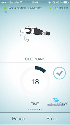 Уже появилась новая прошивка для гарнитуры, скачать ее можно здесь, есть версии ПО и для Mac, и для Windows. У моей гарнитуры была прошивка 1.1.0, новая версия ПО 1.3.0. Я решил попробовать, как изменилась работа датчика, переключил приложение в режим ходьбы и нажал Start на дорожке и в программе. Первое время оба прибора показывали плюс-минус сходные данные, вот я прошел сто метров, вот стопятьдесят, но затем показания программы Jabra убежали далеко вперед. После двадцати минут ходьбы расхождение в пару сотен метров. Кому верить? Я верю дорожке. И еще верю Apple Watch, и еще я верю тому, что показывает датчик в самом iPhone. Попробовал еще раз. Гарнитура удивила, теперь данные отставали от тех, что были на дорожке. В общем, датчик работает очень странно и серьезно на него рассчитывать во время бега или ходьбы не стоит. Программа неплохо подбирает музыку для тренировок, видимо, как-то сканирует треки по жанрам, в основном берет рэп и что-то в этом духе, классику не давали слушать ни разу. И еще постоянно фигурировала музыка группы The Sect, это drum&bass, мне нравится, уже давно купил пару альбомов и слушаю периодически в машине. Оказалось, для тренировок тоже очень хорошо. Из того, что хочу отметить особо, пока не перешел к описанию Jabra Sport Life. Кроме бега, здесь есть хорошие подборки упражнений для кроссфита, ну, по крайней мере мне так показалось. Ими можно пользоваться даже без гарнитуры. Например, PushPerfection, отжимания, планка, отжимания другого типа, боковая планка ну и так далее. Без наушников играет музыка в динамик iPhone, есть описания упражнений и поз. Приложение Jabra Sport LifeДанный продукт – программно-аппаратный комплекс, использовать Pulse без приложения для смартфона попросту глупо. Для iOS и Android можно скачать программу Jabra SportLife, после того, как вы подключите гарнитуру по Bluetooth, можно начинать использовать оба устройства совместно. Как видно, здесь отображается заряд аккумулятора Pulse, засек ли датчик пульс, прошедшее с начала тренировки время, дистанция, скорость, количество уничтоженных калорий, при желании можно поменять все эти показатели местами. Или вывести на экран только два самых важных для вас показателя. Когда вы заканчиваете тренировку, все данные сохраняются, можно посмотреть и вспомнить, как все происходило на прошлой неделе или в прошлом месяце. То есть можно наблюдать прогресс – или регресс. При желании результаты тренировки можно «расшарить» в Facebook/Twitter, добавить фото, доступен и детальный анализ.
