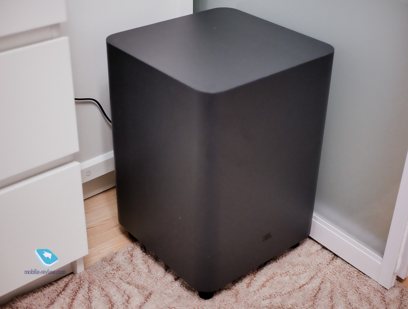 Однако стоит отметить, что серый цвет не всегда может подойти под интерьер. У меня ТВ-тумба и шкафы белого цвета, и акустика на их фоне смотрится несколько инородно. Может быть, лучше, если бы Bar 9.1 был черным?.. Сабвуфер сделан из прочного, почти монолитного пластика серого цвета. Казалось бы, простая кубическая форма, но она выполнена идеально: снова никаких нестыковок, бесполезных декоративных элементов. Строго и стильно.