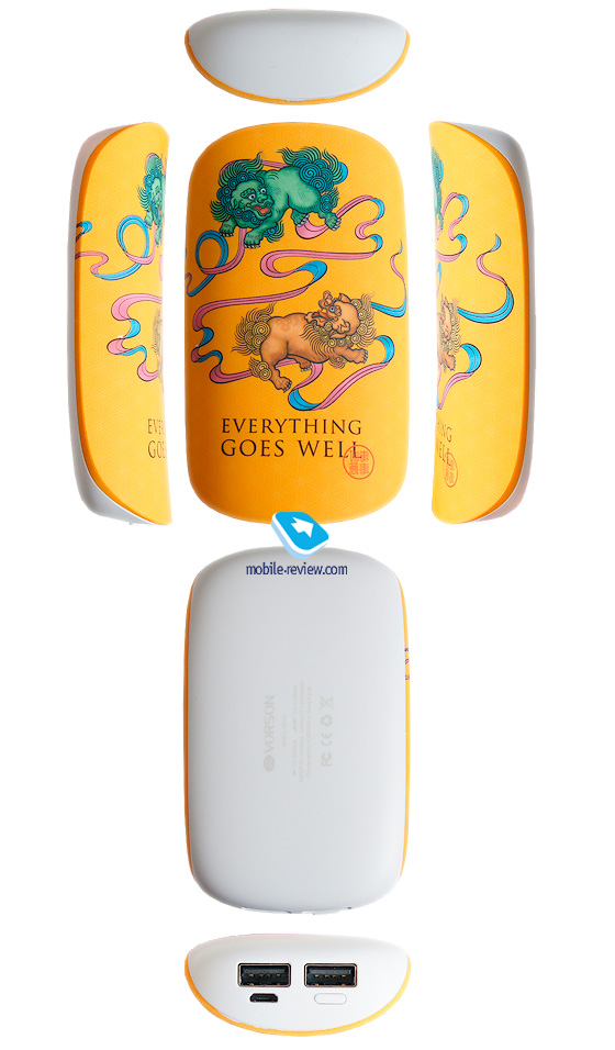 Так выглядит оригинальный (не праздничный) Vorson Shell 6000 Именно эта версия аккумулятора меня привлекла своим дизайном. Хотя форма корпуса у этой модели и у обычной одинакова, как и большинство других параметров, разница только в типе пластика на лицевой стороне и раскраске. В этой версии было четыре варианта оформления лицевой стороны аккумулятора, разные драконы и узоры – выглядит все очень здорово и необычно. Поверхность матовая, напоминает прорезиненный материал, на деле это просто прозрачная матовая наклейка, и если вдруг ее содрать (лучше этого не делать), обнажится обыкновенный гладкий пластик с рисунком. Наклейка в данном случае играет не только защитную роль, а является частью поверхности, и отклеивать ее не стоит.