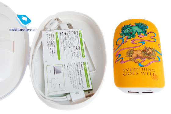 Поставляется аккумулятор в небольшой полупрозрачной пластиковой упаковке, вместе с ним в коробке находится сдвоенный кабель. Одним концом (USB) он подключается к аккумулятору, а с другой стороны - два провода для зарядки устройств – microUSB для почти всей современной техники (смартфон, планшеты, навигаторы, плееры) и широкий Dock Connector для морально устаревшей техники Apple (все, кроме нового iPhone и нового iPad).
