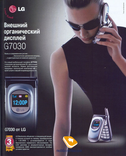Представив год назад серию триплетов, компания Motorola не прогадала. Модели V300, V500, V600 стали действительно популярными и заслужили любовь среди покупателей. Сейчас компания решила повторить успех и представила две идентичные модели: V620 и V535. В этих аппаратах, помимо традиционных для триплетов функций (Bluetooth, качественный дисплей, VGA-камера, Java), появилась возможность видеосъемки, расширена телефонная книга, а также в комплекте теперь идет bluetooth-гарнитура HS820. V535 унаследовала корпус от 300-й модели, однако, цвет изменен на черный. Аппарат выглядит стильно, он подойдет как бизнесменам, так и молодежи. На мой взгляд, продажи V535 повторят таковые у V500, и во многом этому будет способствовать активная рекламная кампания – к слову, ТВ-ролик был запущен на 10 каналах в Москве, это очень высокий показатель. Принт телефона выполнен в устоявшемся стиле Motorola – на нем как всегда изображена молодая девушка. Она наклонила голову назад и, похоже, получает удовольствие от разговора, который ведет с помощью bluetooth-гарнитуры. Волосы девушки взъерошены – создается впечатление, что она двигает головой. В качестве фона постера был выбран белый цвет, он заметно освежает общую картину. Слоган, по традиции Motorola, состоит из 3-х слов и звучит как «СТОПМОТОСНЯТО». Похоже, в компании посчитали функцию видео- и фотосъемки главенствующей. В целом постер телефона V535 такой же, как и предыдущие принты производителя – привлекательный, но скучный. Напоследок я бы посоветовал компании Motorola поменять темы рекламных кампаний – все-таки, кроме молодых девушек есть еще множество других интересных идей. Архив рекламных постеровLG G7030