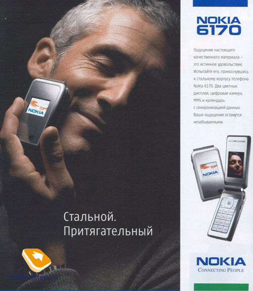Компания Sagem редко балует нас функциональными телефонами, в основном её модельный ряд состоит из бюджетных, недорогих аппаратов. MyX-8 совершенно иная модель, набор её характеристик редок для производителей второго эшелона, он действительно высок: здесь присутствует один из лучших экранов на рынке, камера 1.3 мегапикселя с большим количеством настроек, 40 Мб памяти плюс возможность её расширения с помощью флэш-карты miniSD, Bluetooth, MP3-плеер, словом, всё, что присуще бизнес-моделям. Недаром большинство журналистов окрестило аппарат смартфоном, но это не является правдой. Интересно, что стоимость myX-8 всего 330$, это нетипично для телефонов с таким функциональным набором. Также хочется отметить, что дизайн корпуса разработан французским дизайнером Ora-lto, который также работает с Louis Vuitton и Swatch (эти марки скажут о многом). Многим понравится незаурядность телефона, он не похож на что-либо другое. Можно уверенно сказать, что Sagem myX-8 станет популярным на нашем рынке, этому способствует немалая функциональность и более чем адекватная цена. Некоторых могут отпугнуть размеры, но, к слову, габариты конкурирующего Sony Ericsson S700i тоже немалы. Постер myX-8 состоит из двух паззлов (это фирменный стиль Sagem). На верхнем мы можем увидеть тематическое фото, на нижнем – описание основных возможностей аппарата и его изображение. Дизайн верхней картинки, как и сам телефон, разработан дизайнером Ora-Ito. Именно поэтому она отлично гармонирует с обликом аппарата. На фото изображена девушка, спящая за стеклянным компьютерным столом. Однако компьютер здесь необычен, он является плодом фантазии Ora-Ito. Я не буду описывать внешний вид монитора и клавиатуры, скажу лишь, что все элементы выглядят весьма гламурно – Nokia, пожалуй, позавидовала бы. В углу стола стоит подставка с удивительным цветком, и этот же цветок изображен на дисплее телефона. Слоган звучит как «Единство дизайна и технологий». Действительно, телефон удачно сочетает великолепный фирменный дизайн и высокую функциональность. На мой взгляд, постер Sagem myX-8 действительно удался. Компания не поскупилась и обратилась к дизайнеру Ora-Ito, а результат совместной работы налицо – это один из лучших принтов последнего времени. Nokia 6170