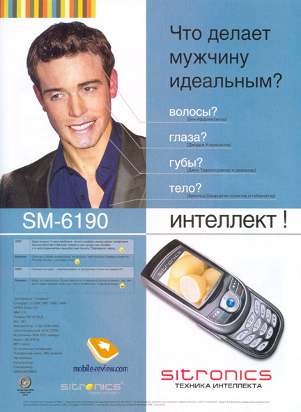 До недавнего времени российский производитель электроники, Sitronics, в мобильном мире был известен как поставщик телефонов для оператора МТС. Но проект оказался неудачным и вскоре был закрыт. В середине марта Sitronics возродился уже с собственными разработками. На прилавках появилось 4 модели: два моноблока среднего сегмента, функциональная раскладушка и слайдер SM-6190. Интересно, что в модельном ряду фирмы нет бюджетных решений стоимостью ниже 100$, думаю, это отрицательно скажется на продажах. В любом случае, приятно, что отныне и Россия производит телефоны, даже несмотря на их низкое качество и неизвестность бренда. Модель SM-6190 – это недорогой, но весьма симпатичный слайдер. Он представлен в черном цвете и своим дизайном напоминает модель SL300m от Fly. Набором характеристик аппарат не может похвастаться, впрочем, что вы хотели за 4 тысячи рублей? Имеются такие функции, как VGA-камера с возможностью записи видео, 40-тональная полифония, WAP 2.0 и MP3-плеер (!) при 16 Мб памяти. В итоге телефон получился сбалансированным: с одной стороны, он имеет привлекательный внешний вид, с другой – идеальное отношение цена-функциональность. Но мне не кажется, что его продажи будут бить все рекорды. Во-первых, устройство разработано отечественной компанией, а сложившиеся стереотипы не позволяют считать российскую электронику качественной. Дешевой – да, но не качественной. Во-вторых, модель SM-6190 действительно имеет некоторые огрехи в программном обеспечении, порой она работает нестабильно. Поэтому я склонен считать, что «Ситроникс» задержится на нашем рынке ненадолго. Рекламный принт новинки подтверждает мои слова. Рекламисты решили запихнуть в него все свои задумки, как интересные, так и откровенно глупые. Начнем с того, что лозунг компании Sintronics – «Техника интеллекта». Мобильные телефоны, получается, тоже высокоинтеллектуальные. Чтобы доказать это, слайдер SM-6190 сравнили с мужчиной. На верхней половине постера изображен представитель сильного пола с идеальной внешностью. Волосы ему достались от Бена Аффлека, глаза от Джорджа Клуни, губы от Джона Траволты и тело от Арнольда Шварценеггера. Взрывная смесь! Но, оказывается, мужчину делает идеальным не его образ, а интеллект. Правда, я не думаю, что это относится к телефонам. Стали бы вы пользоваться суперфункциональным аппаратом, но в уродливом корпусе? Однозначно нет. На нижней половине страницы, помимо перечисления основных характеристик, размещена очередная фишка рекламистов «Ситроникс». Небольшая таблица содержит в себе разговор из форума. Человек по имени OZZI никак не может выбрать из широкого ассортимента Sitronics, но на помощь ему совершенно случайно приходит Boomerr. Он рассказывает, что это самые лучшие телефоны на земле, что они никогда не глючат и советует сомневающемуся OZZI слайдер SM-6190 – «хорошую вещь!». Словом, такого бреда я за два года работы в качестве обозревателя рекламы не видел ни разу. Рекламный принт телефона Sitronics SM-6190 мне не симпатичен. Он сумбурен и выглядит несолидно, такая кампания убийственна для зарождающейся марки. Однако я не могу не отметить, что постер приносит позитивные эмоции, можно посмеяться. В апреле, параллельно с выходом ТВ-ролика, компания Samsung начала outdoor-кампанию телефонов D800, P300 и Z540 под названием «Тонкость во всех проявлениях». На плакатах рекламируемые аппараты изображены в 
