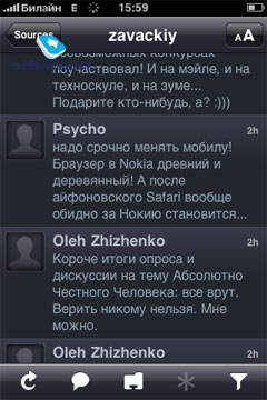 Я думаю, очень много людей, собираясь вечером куда-либо, совершают простой и действенный ритуал - заходят на сайт Afisha.ru. Там есть все. Скажем, если вы только что вернулись с необитаемого острова и вновь внедряетесь в социум, то «Ашифа» поможет вам понять, что пойти посмотреть, куда пойти поесть, что послушать, какие актуальные спектакли, выставки и места. Наверняка вам знаком этот сайт, так же, как и «Формула Кино» на Можайке, фильмы там не кончаются никогда. Ну и вот, счастье владельцев iPhone в том, что для изучения расписаний теперь не нужен компьютер, прямо с аппарата можно посмотреть, что, где и как. Мало того, вот, скажем, рестораны. Используя местоположение, программа выводит на дисплей ближайшие к вам места. Помимо адреса показывается и всякая полезная информация, например, в ресторане «Два кувшина» не принимаются кредитные карты, нет доставки и нет парковки. Надо нам идти в такой ресторан? Нет. А вот в ресторане «Грот» карты принимают, парковка есть, и даже есть рецензия от некоего Дмитрия от 10 мая: «Мне очень нравится это заведение. Очень приятная кухня и какая-то культурная, интеллигентная...». Что хотел сказать человек - до конца непонятно. Но мы с вами можем понять одно: скорее всего, ресторан «Грот» будет лучше, чем «Два кувшина». Остается сказать, что для каждого раздела доступны фильтры, например, можно посмотреть выставки не только по алфавиту, но и по оценкам. Кроме этого, есть и календарь, это полезно, чтобы заранее составить свой график посещений. Отличная программа, очень-очень советую. Интерфейс не перегружен, но фирменный стиль сохранен, все очень просто, понятно, быстро и информативно. Горожане, без «Афиши» никуда. Topple 2Это такой тетрис, но на тетрис не очень похожий. Начнем с того, что дизайн этого приложения крайне хорош. Красиво нарисованные фигурки, интересно сделанное меню, хорошая музыка. Сам игровой процесс довольно оригинален: вам нужно складывать фигурки таким образом, чтобы достичь определенной планки (по высоте), затем следующей. Если бы кривляющиеся фигуры просто стояли на месте, то все было бы гораздо проще, но они так и норовят упасть за пределы игрового поля. Поэтому приходится контролировать и наклон фигур, и еще укладывать их быстро, и желательно делать это логично. Желтое к желтому, красное к красному. Попробуйте, игрушка затягивает. Мало того, есть еще и нечто вроде сетевой игры, есть и соревнование, для этого необходимо пройти простую регистрацию. Twitterrific