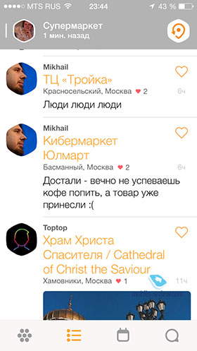Вторая вкладка является аналогом ленты в Foursquare, в ней отображаются все чекины в хронологическом порядке. При желании вы можете поставить комментарий или лайкнуть чекин.