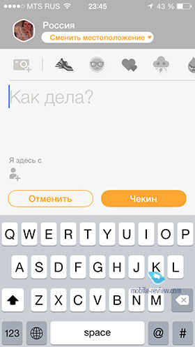 Чтобы «чекнуться», достаточно нажать на иконку в правом верхнем углу. Приложение самостоятельно определит ближайшее к вам местоположение и предложит отметиться там. К чекину вы можете приложить фотографию, указать, с кем вы находитесь, а также добавить индикатор настроения (он появится рядом с вашей аватаркой). Если приложение неправильно определило место, где вы находитесь, то достаточно просто нажать на кнопку «сменить местоположение».