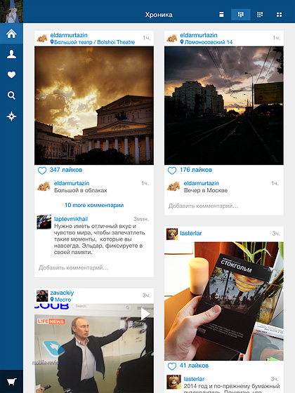 iСофт №78Содержание:RetroНесмотря на то, что оптимизированные приложения для iPad появляются довольно оперативно, есть ряд программ, которые до сих пор не переделаны под большие дисплеи, Instagram – одна из них. К счастью, для этого есть сторонние приложения, в том числе и Retro. После авторизации вы попадаете на главный экран, представленный сеткой из фотографий. При желании вы можете изменить отображение на один из четырех вариантов, соответствующие кнопки находятся в левом верхнем углу.
